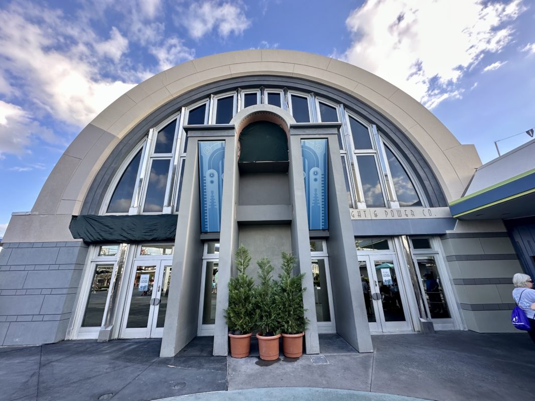 Part of the sign for Tomorrowland Light & Power Co. has been covered. There is no reopening date for Tomorrowland Light & Power Co. but the sign being covered suggests the store may receive a new name.
