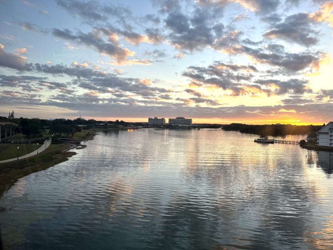 The park opened at 8:00a.m. this morning and we watched the sunrise on our monorail trip to Magic Kingdom.