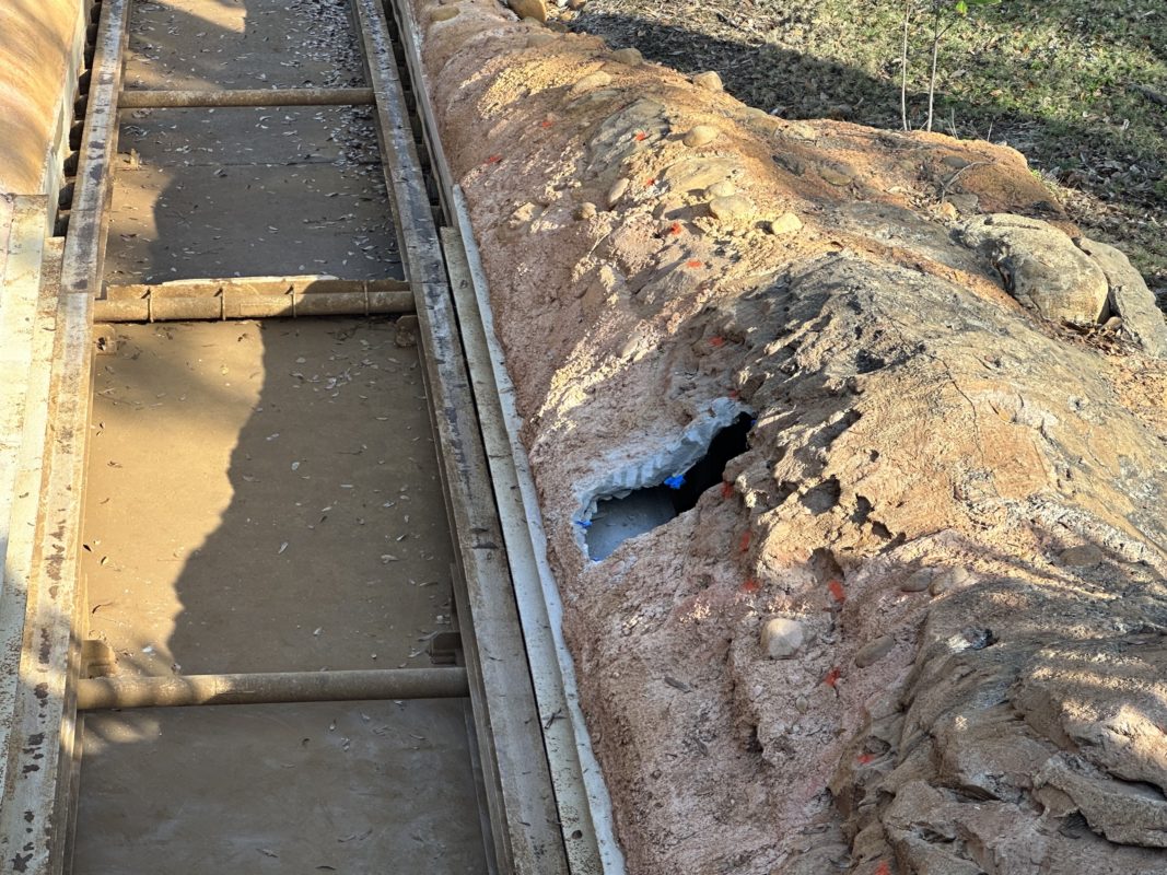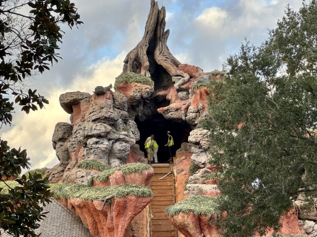 A large hole has been cut into the rockwork at Splash Mountain.