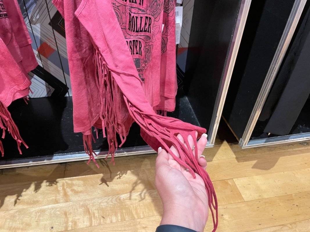 The side of the top has dangling strings of fabric, so it looks like a concert T-shirt that has been altered.