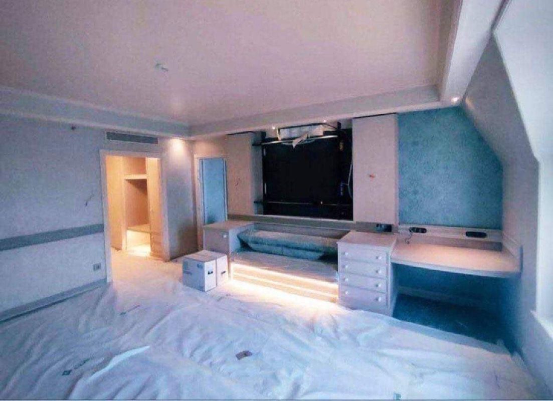 The photos, by a contractor, show the interior of a room with blue accents and intricate wall paneling.