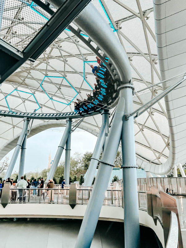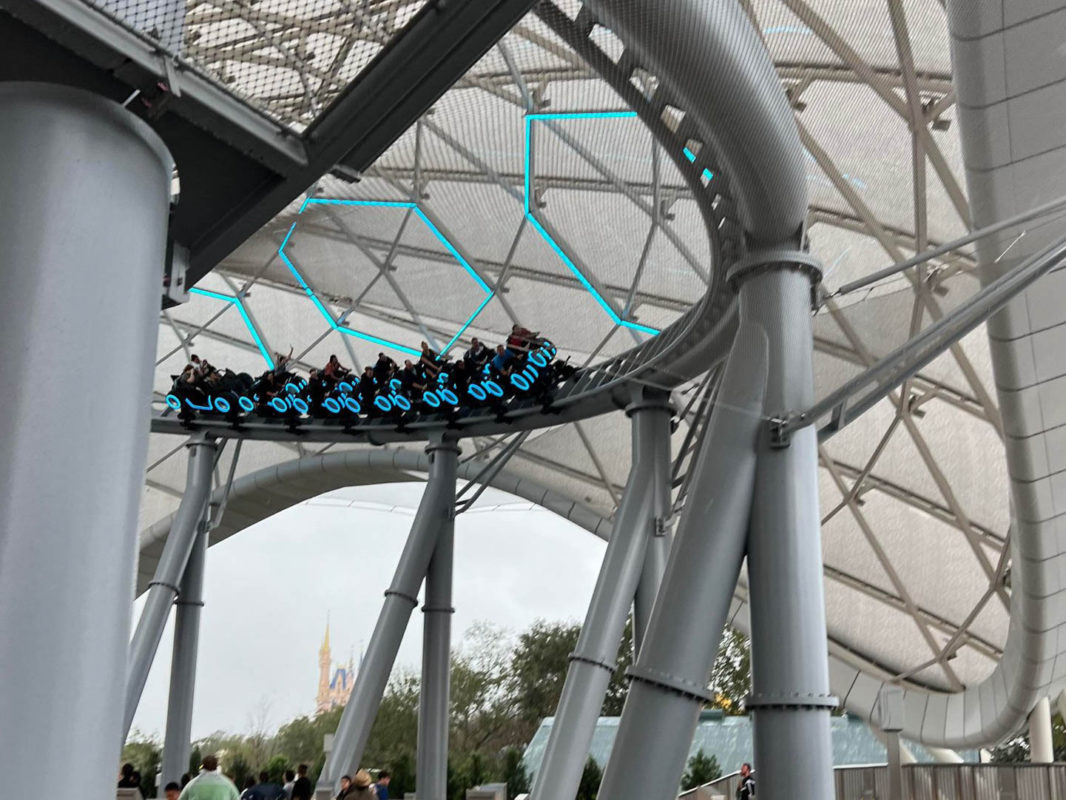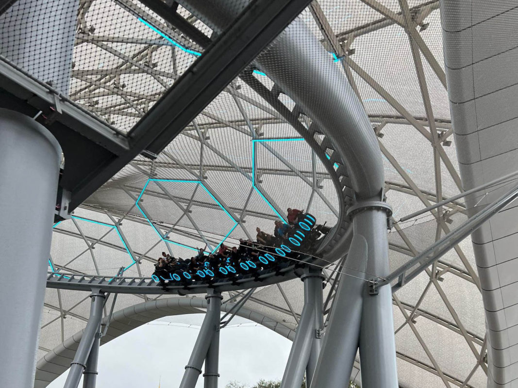 The coaster takes guests beneath a light-up canopy called the Upload Conduit.