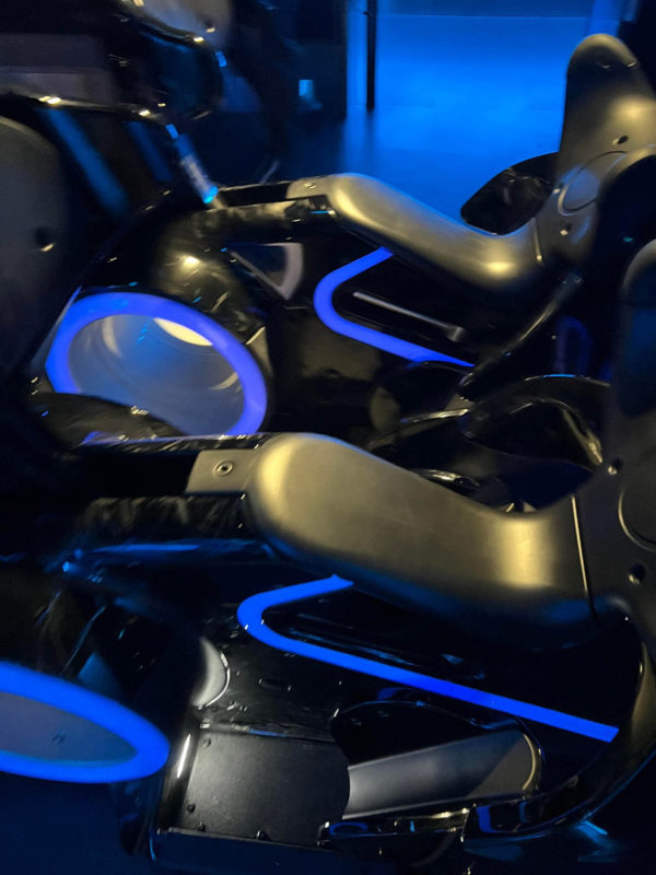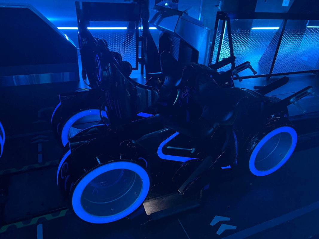 Here’s a train of lightcycles at the unloading station. Guests will sit on them like bikes, similar to Avatar: Flight of Passage.