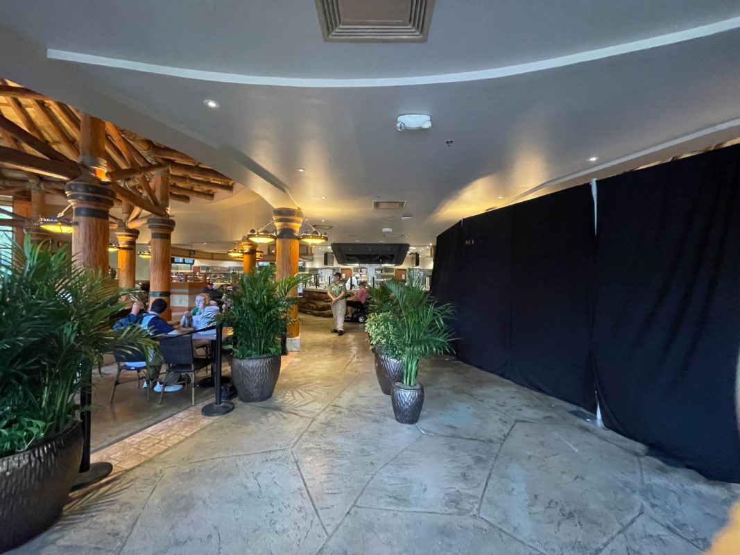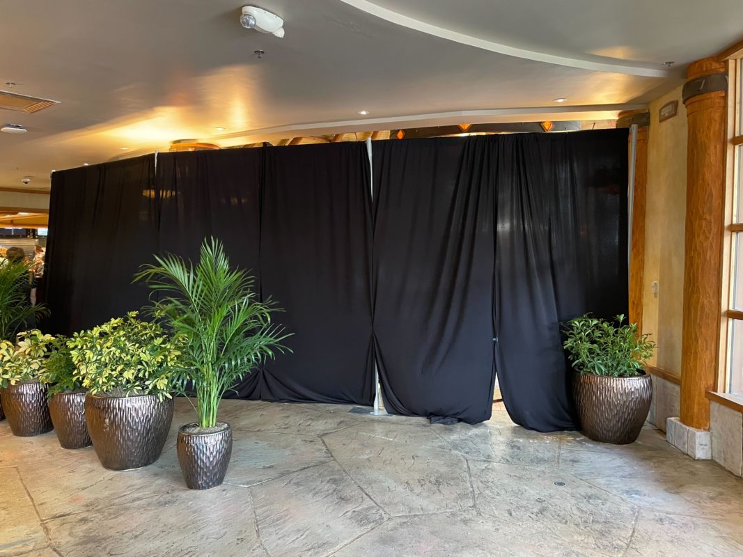 Inside, the black curtains and planters block the right side of the restaurant.