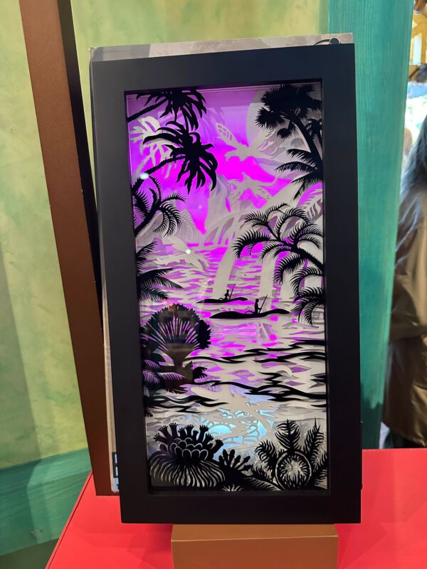 This light up shadow box features several layers of die cut designs illustrating a tropical scene with Na’vi and banshees on the Pandoran ocean.