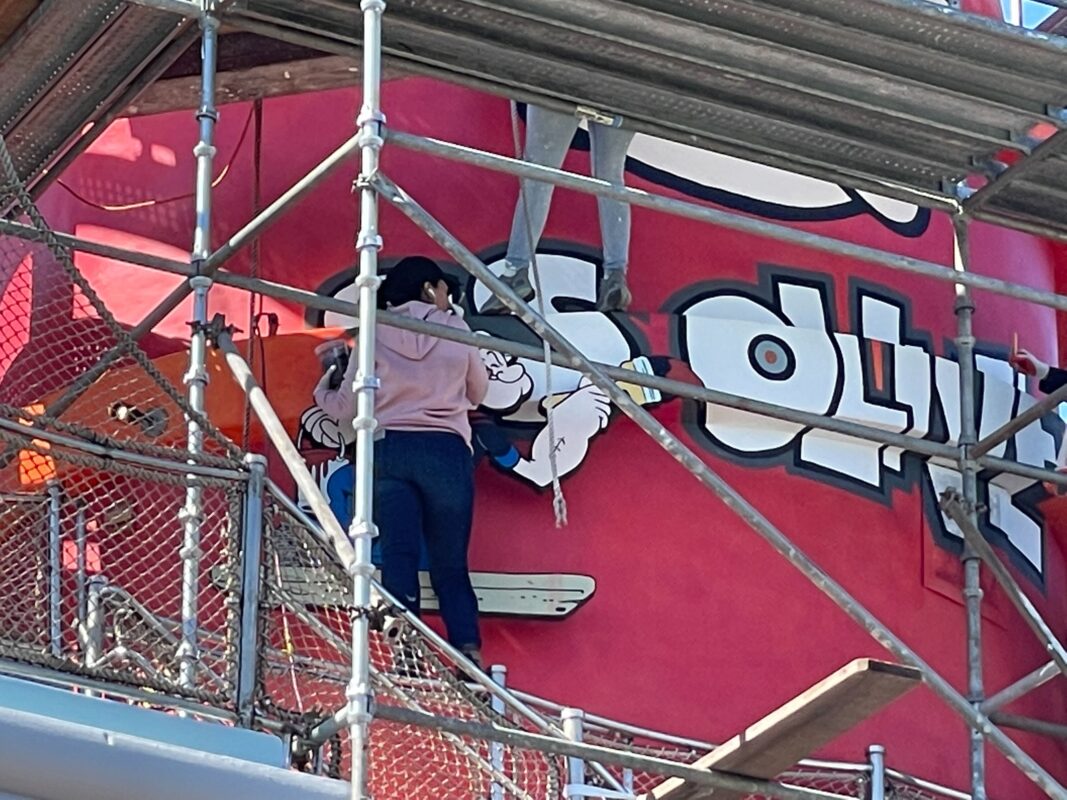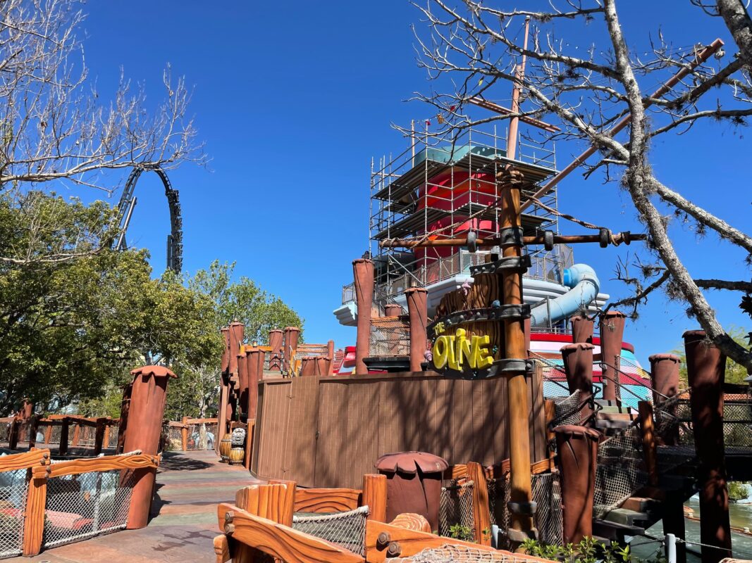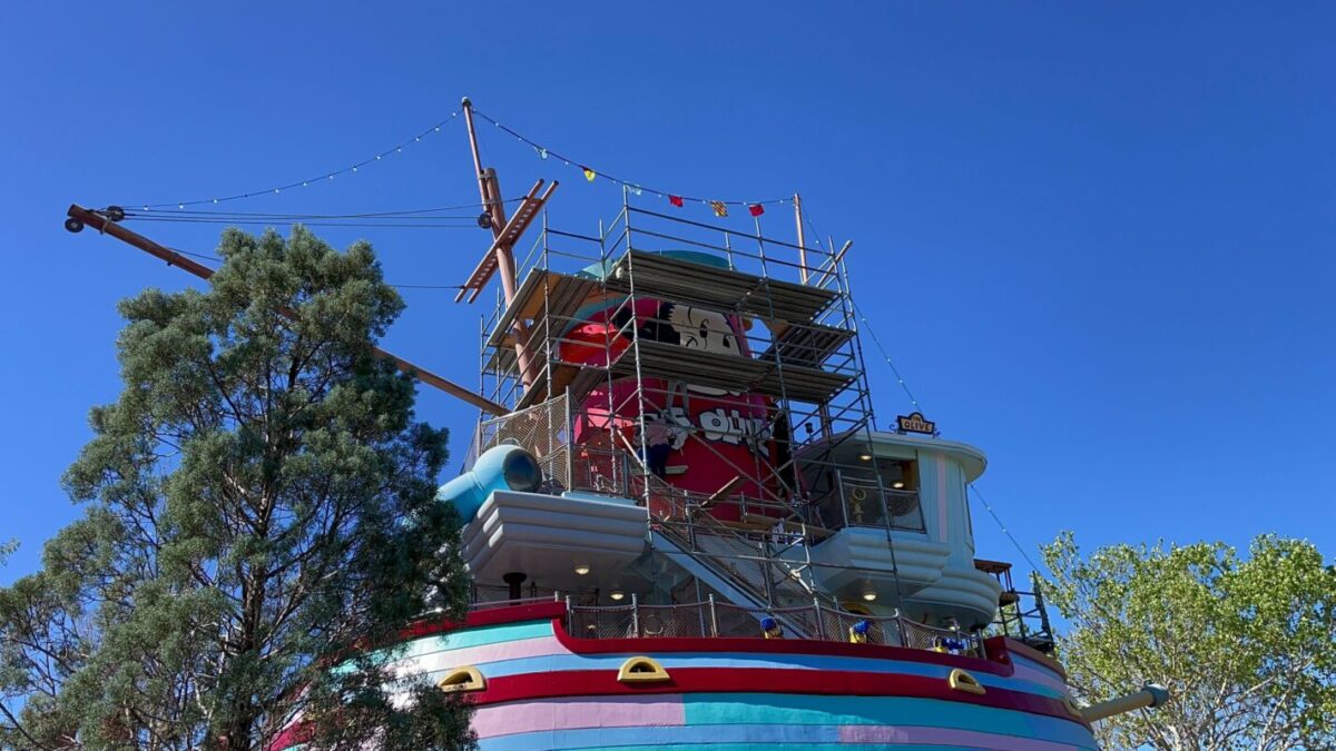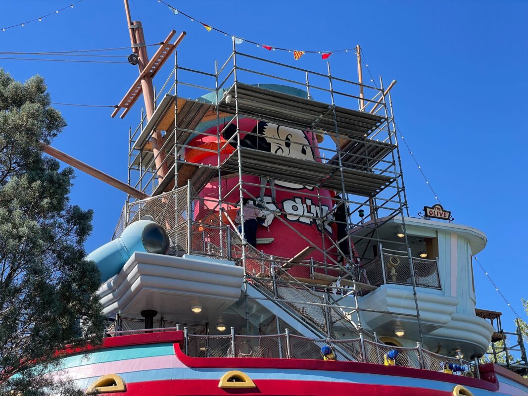 Though Popeye & Bluto’s Bilge-Rat Barges and Wimpy’s have reopened in Universal’s Islands of Adventure, Me Ship, The Olive remains closed for refurbishment. We saw crews touching up the paint on the ship’s funnel.