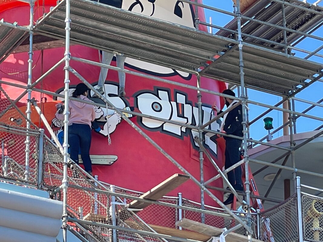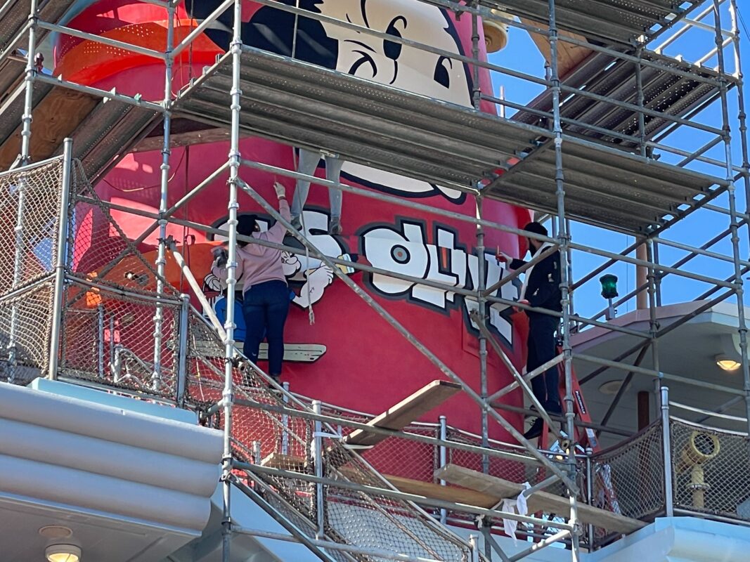 Scaffolding currently surrounds the funnel and we saw three crew members painting during our most recent visit.
