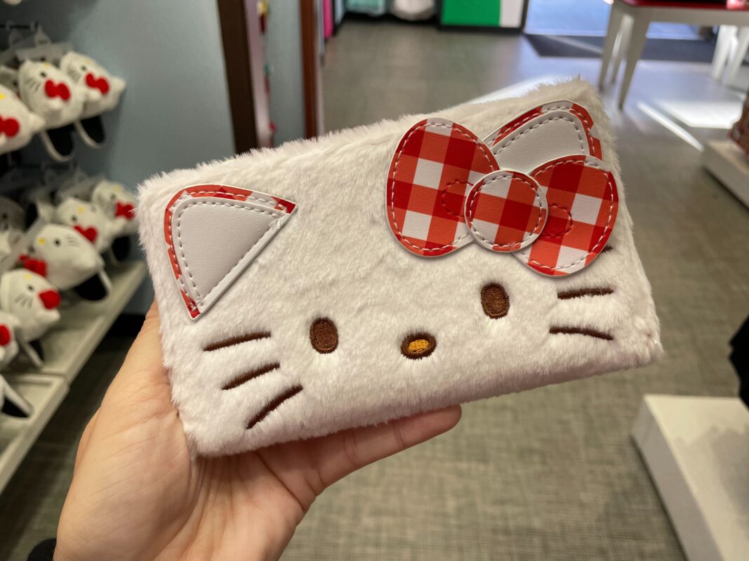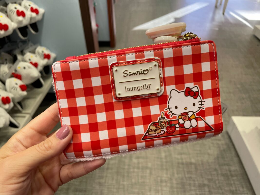 The other side of the wallet is gingham-patterned with an image of Hello Kitty enjoying a picnic.