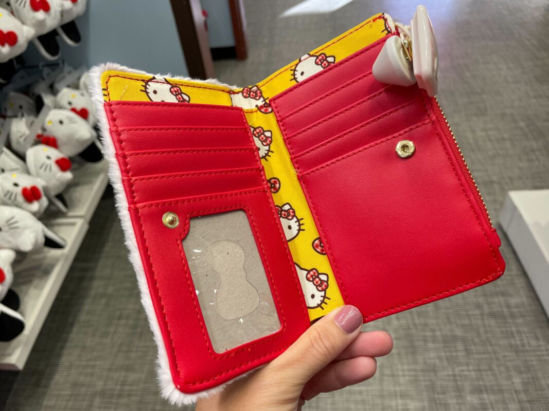 The interior lining is yellow with a pattern of Hello Kitty’s face. The card slots are solid red. The ID slot has a bow-shaped cutout.