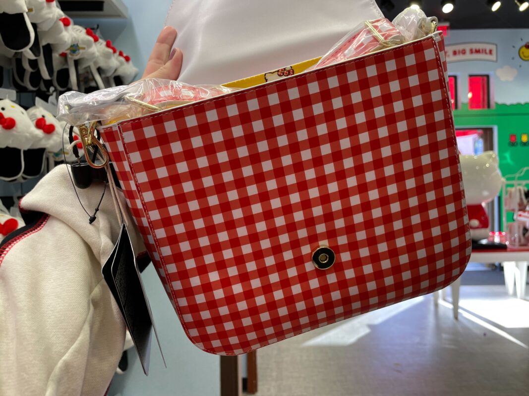 The front pocket is red gingham with a Hello Kitty zipper pull charm.