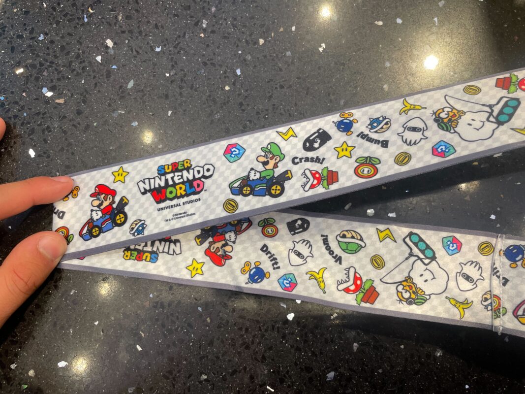 The strap features Mario and Luigi racing along as various items and characters from the Mario Kart games trail behind them, including Super Stars, Blue Shells, Coins, Fire Flowers, Bullet Bills, Bananas, ? Blocks, and more. The Super Nintendo World logo is located near the center of the strap.