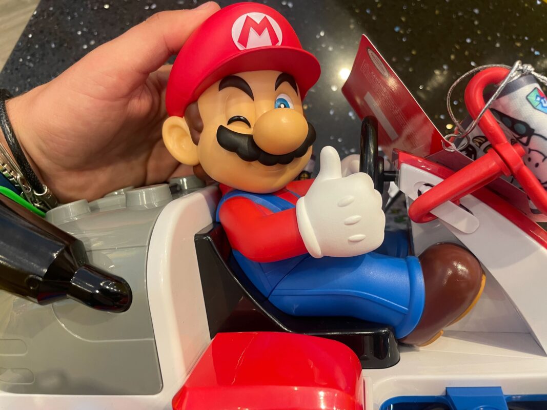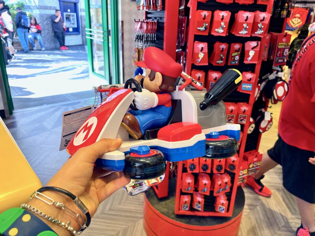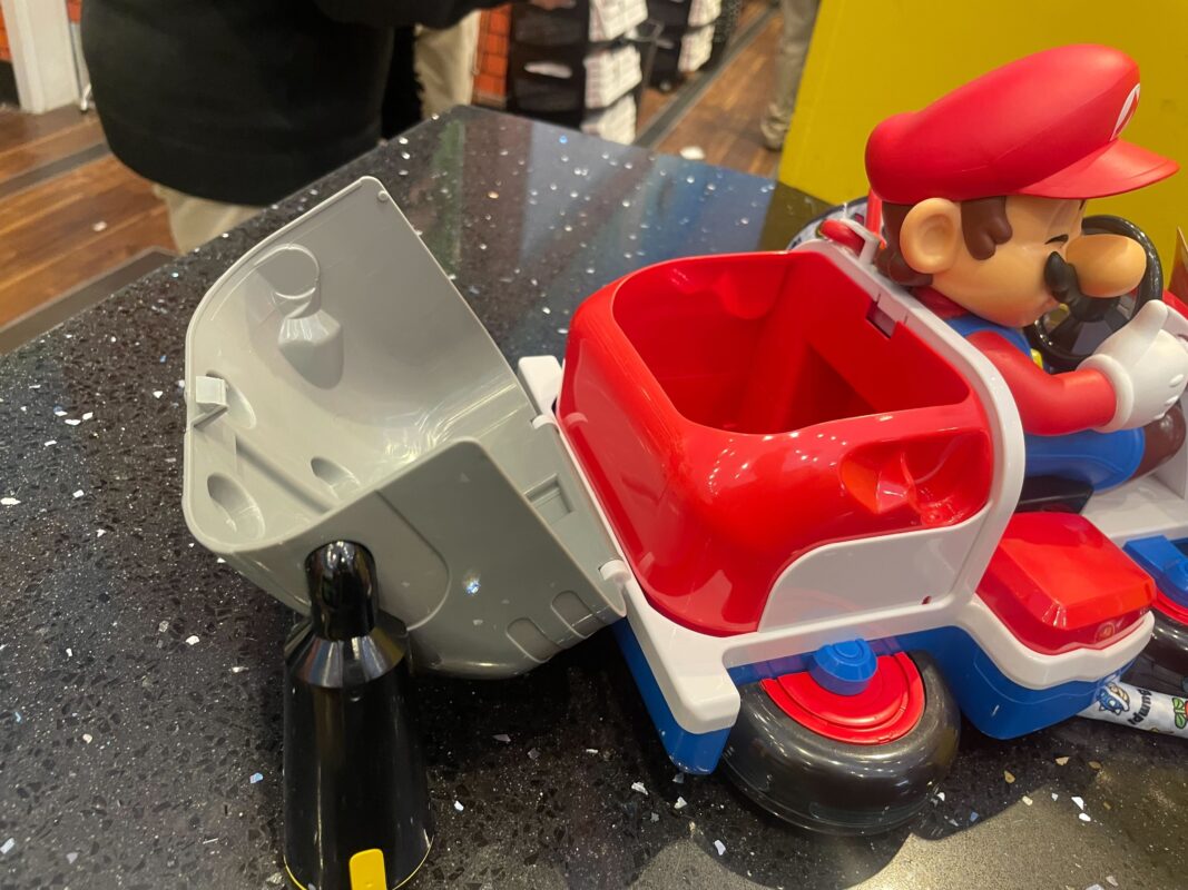 The new popcorn bucket is exactly the same as at Universal Studios Japan. Mario sits front and center on his kart, looking off to the right with a thumbs-up and a wink. A switch on the bottom allows the anti-gravity wheels to light up.
