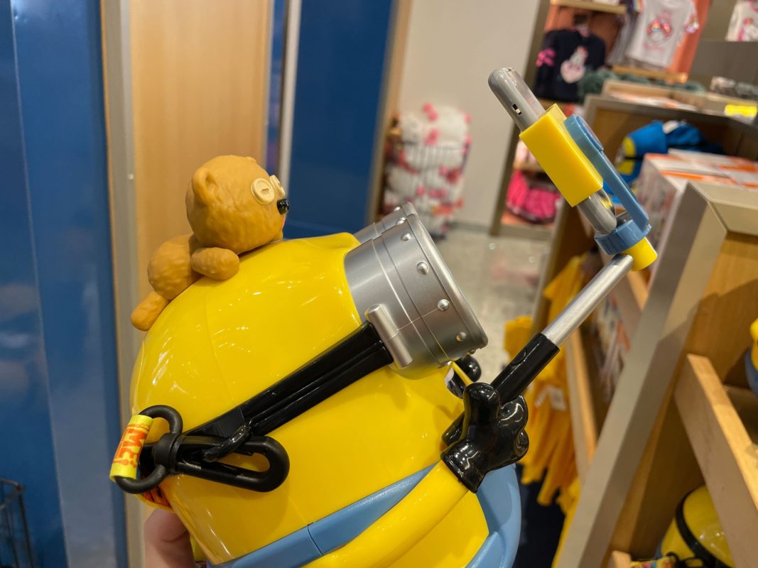 This is Bob the Minion, who has one green eye and one brown eye. His teddy bear Tim sits on his head.
