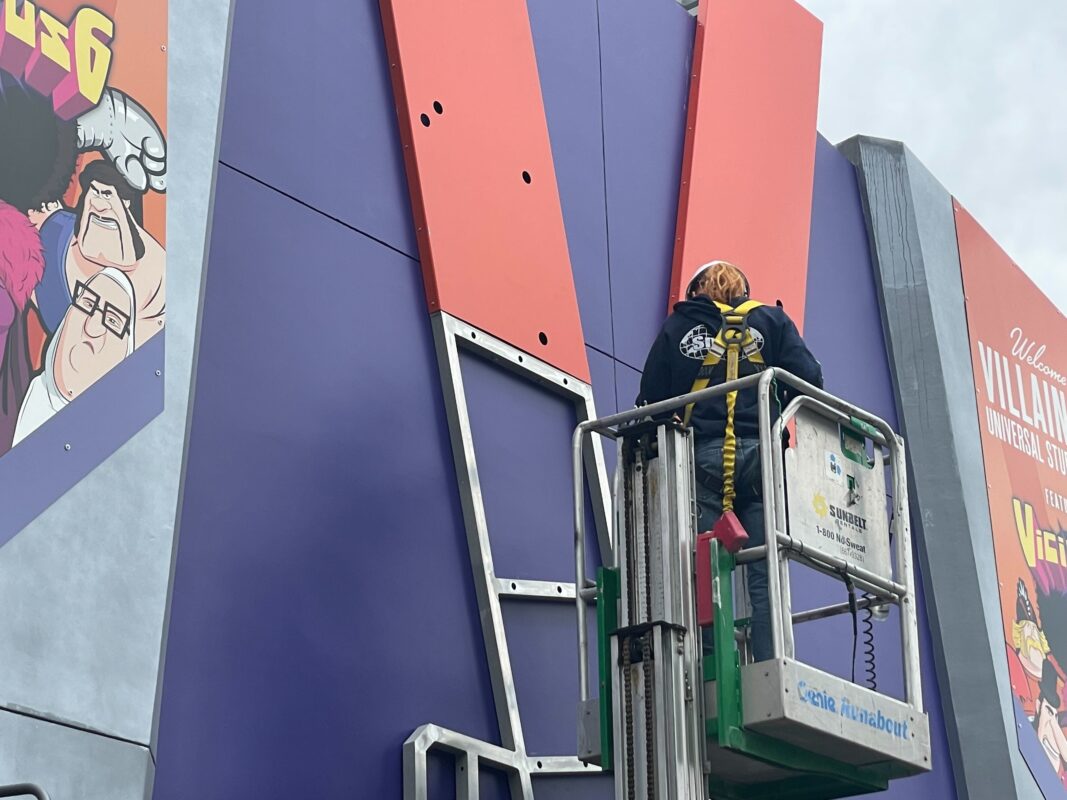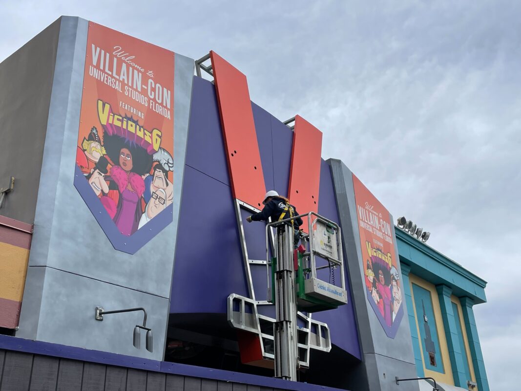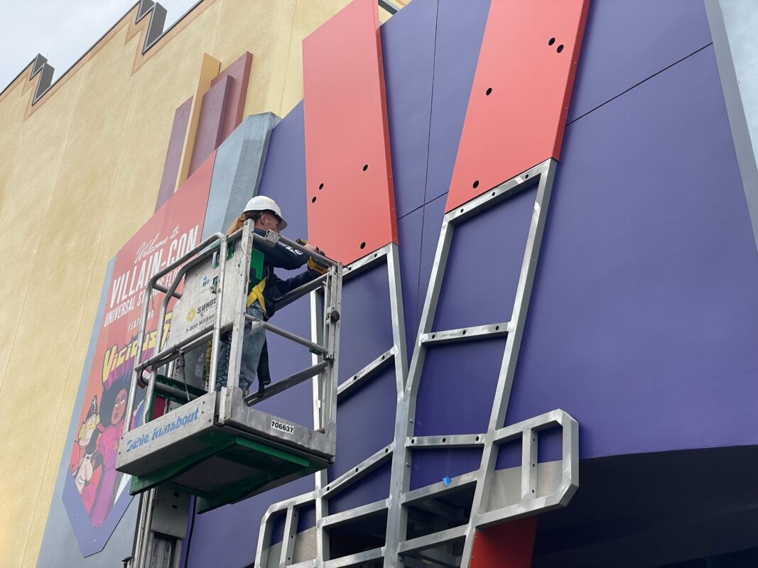Villain-Con Minion Blast construction has been coming along quickly over the past few months, and today, the installation of a large “V” began on the façade.