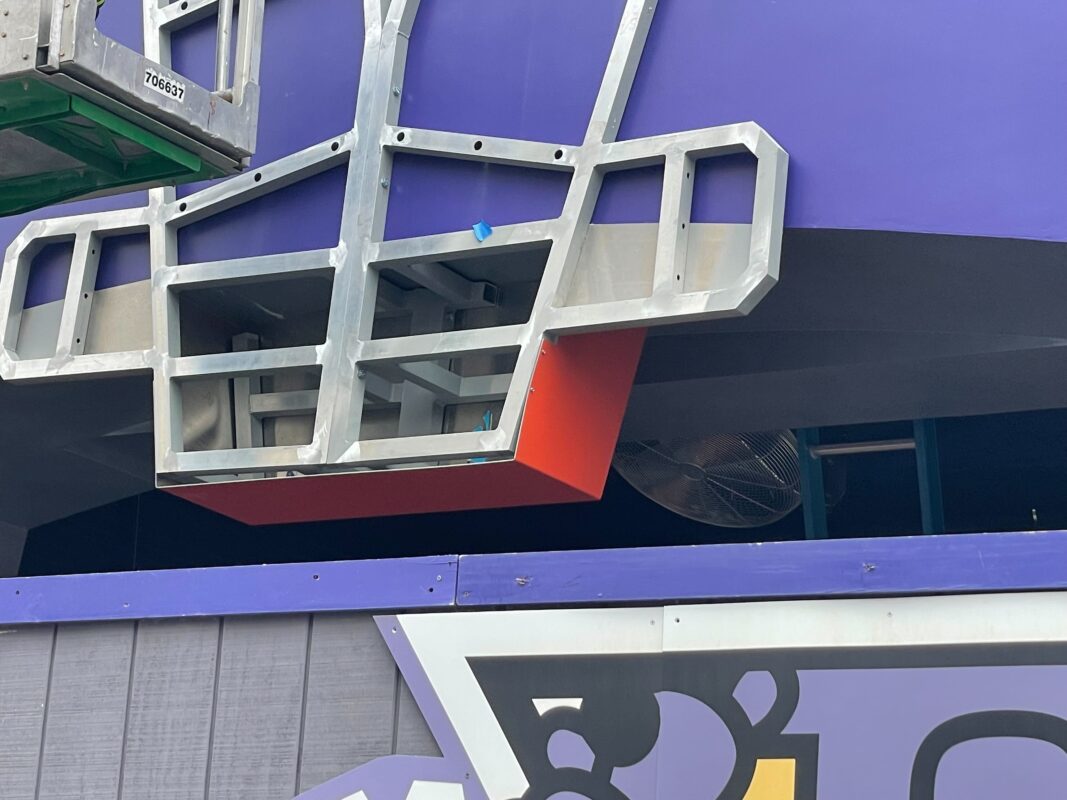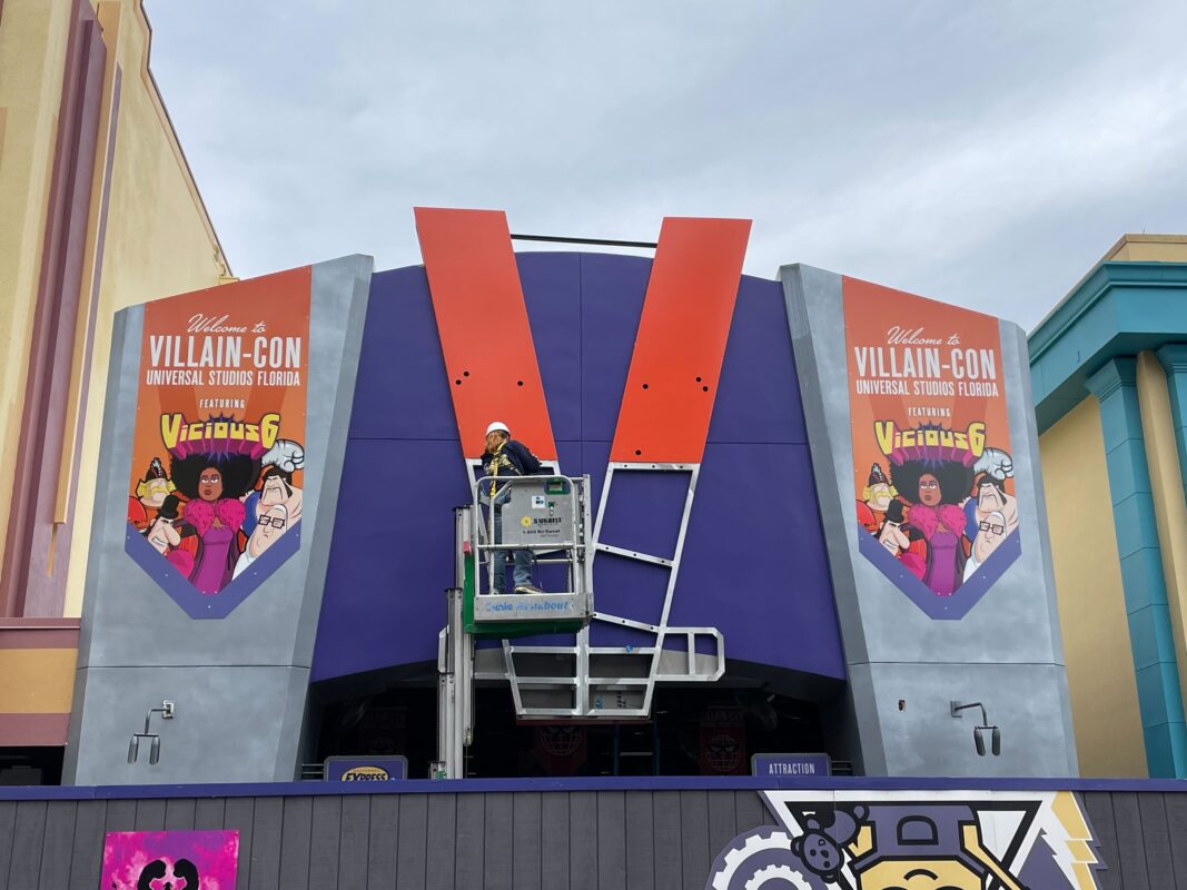 The “V,” which presumably stands for Villain-Con, is centered on the front of the attraction. The empty space below it looks like it will be the future home of the attraction’s name marquee.