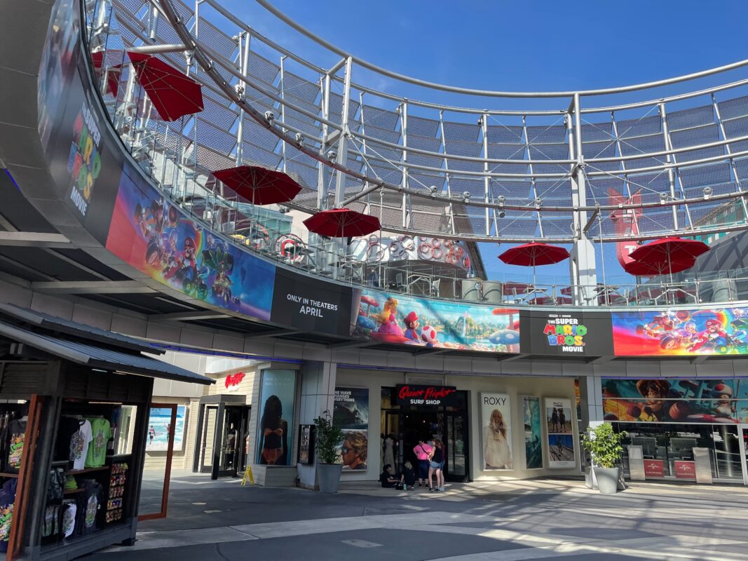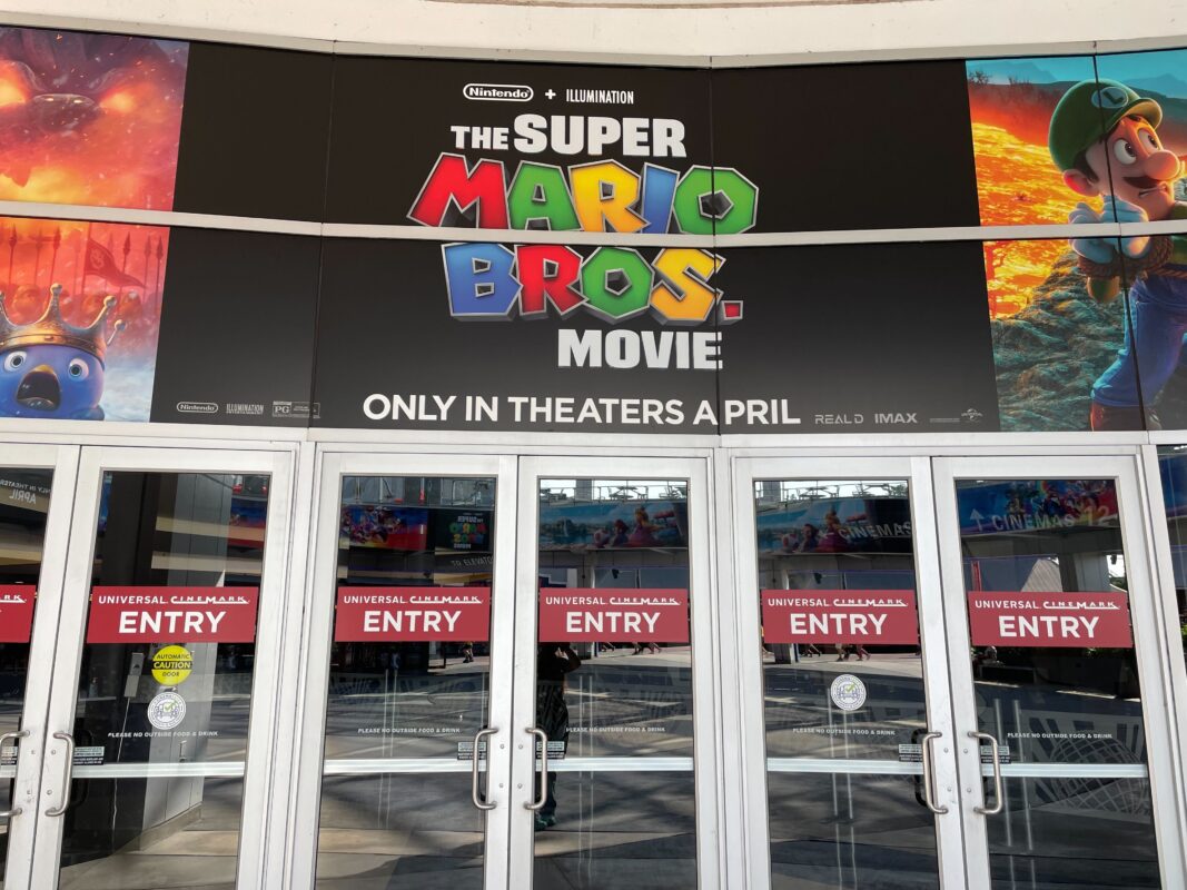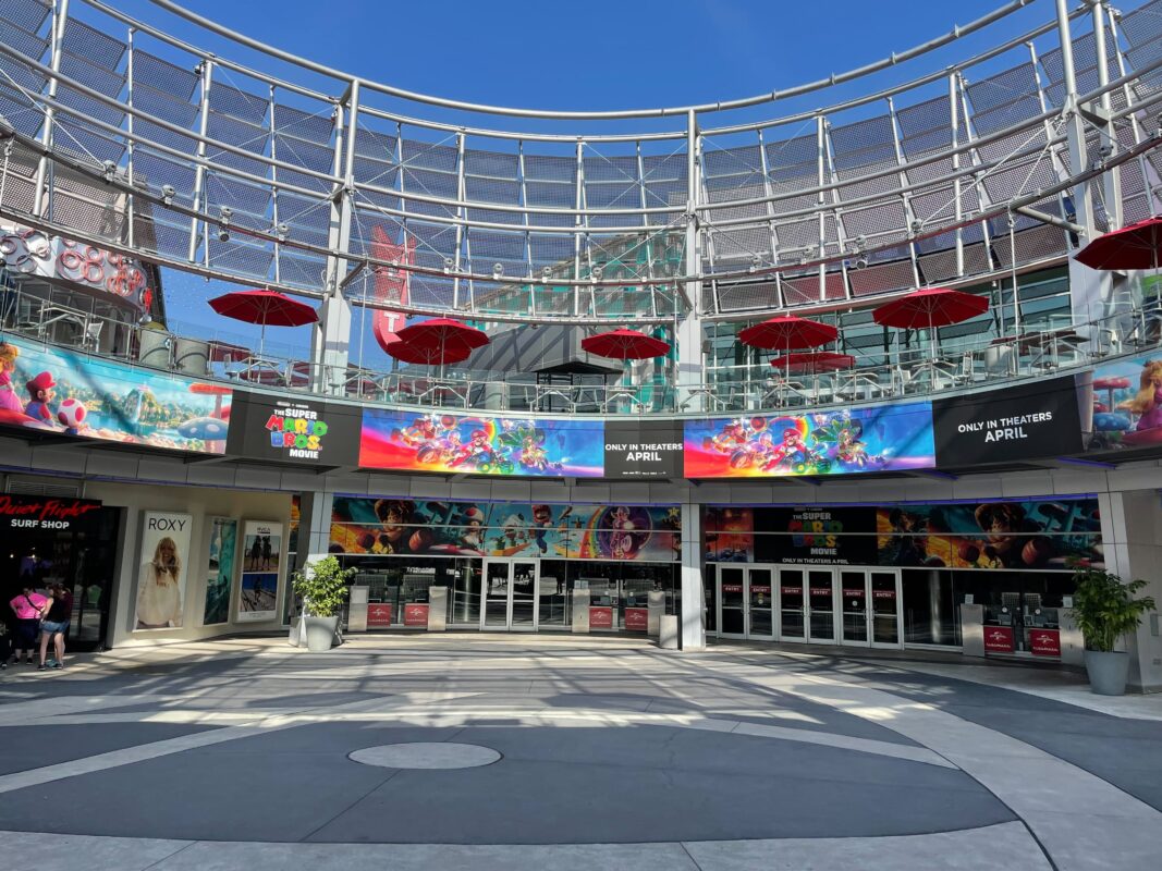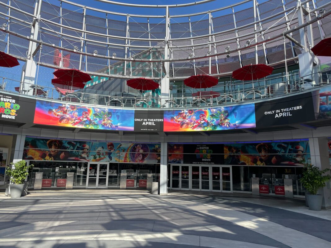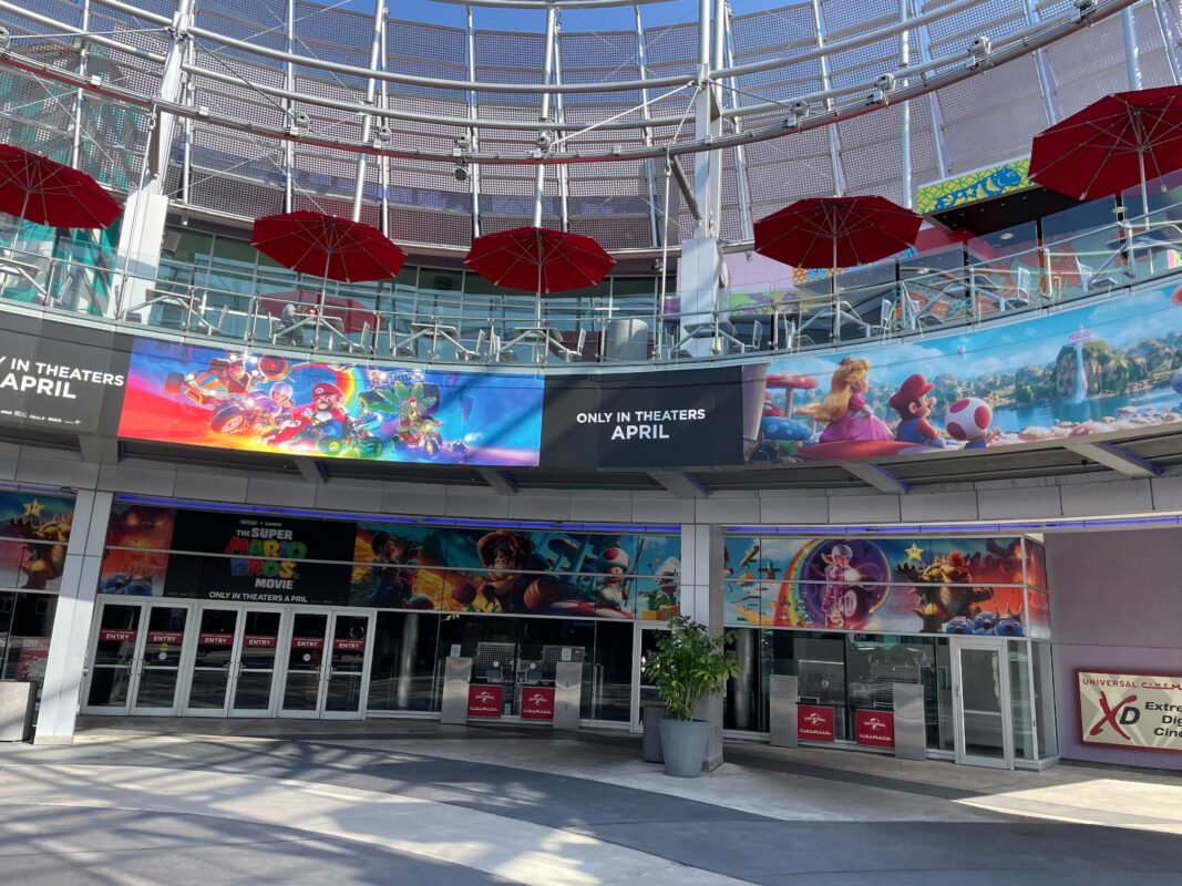 Banners for “The Super Mario Bros. Movie” line the Cinemark courtyard in Universal CityWalk.