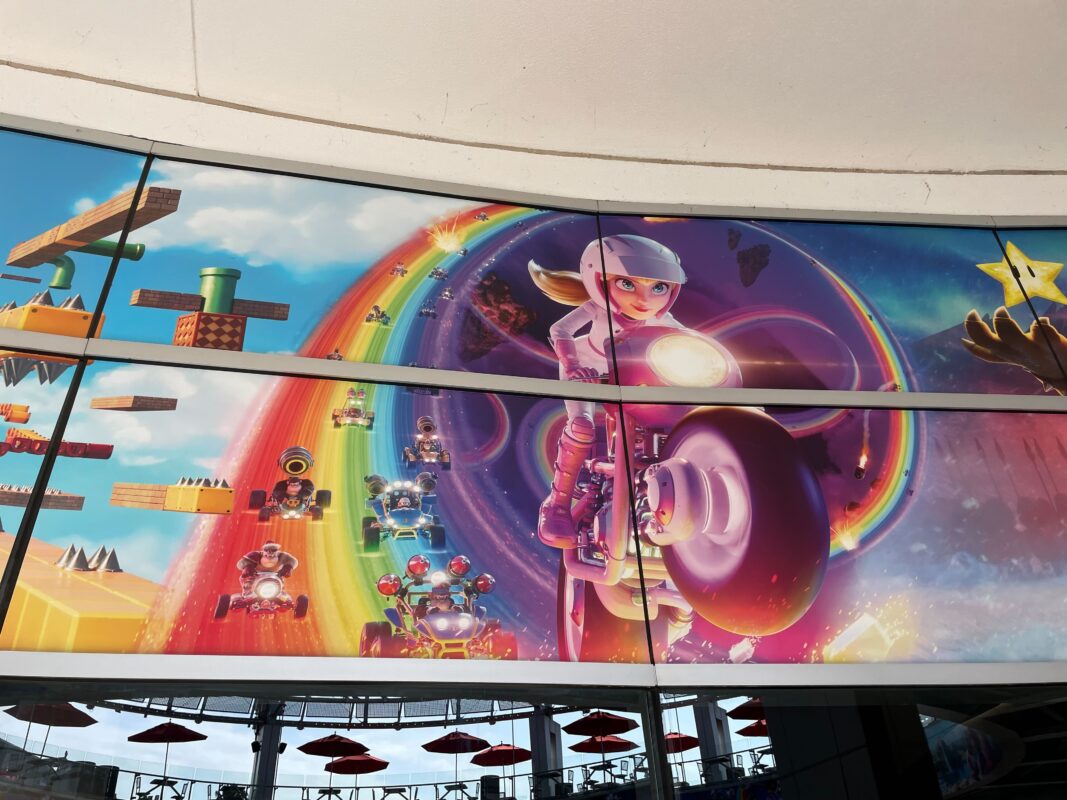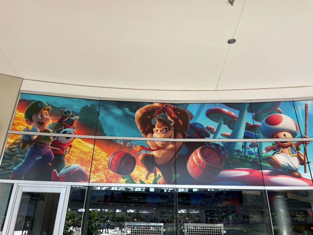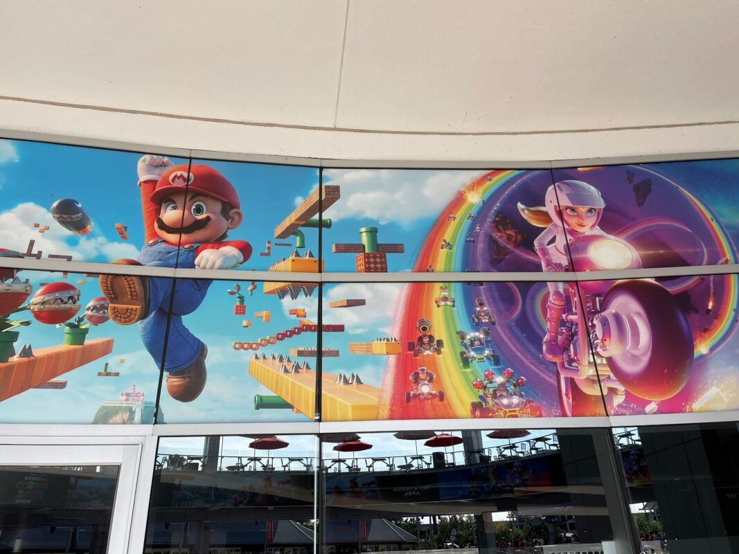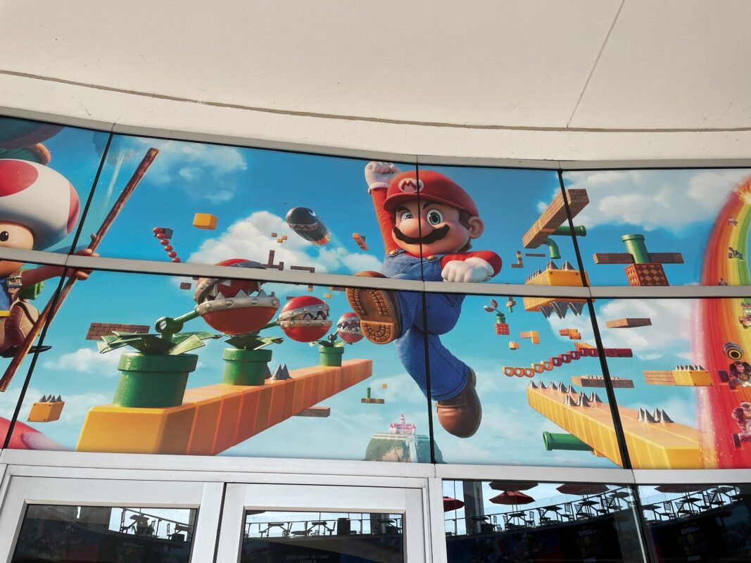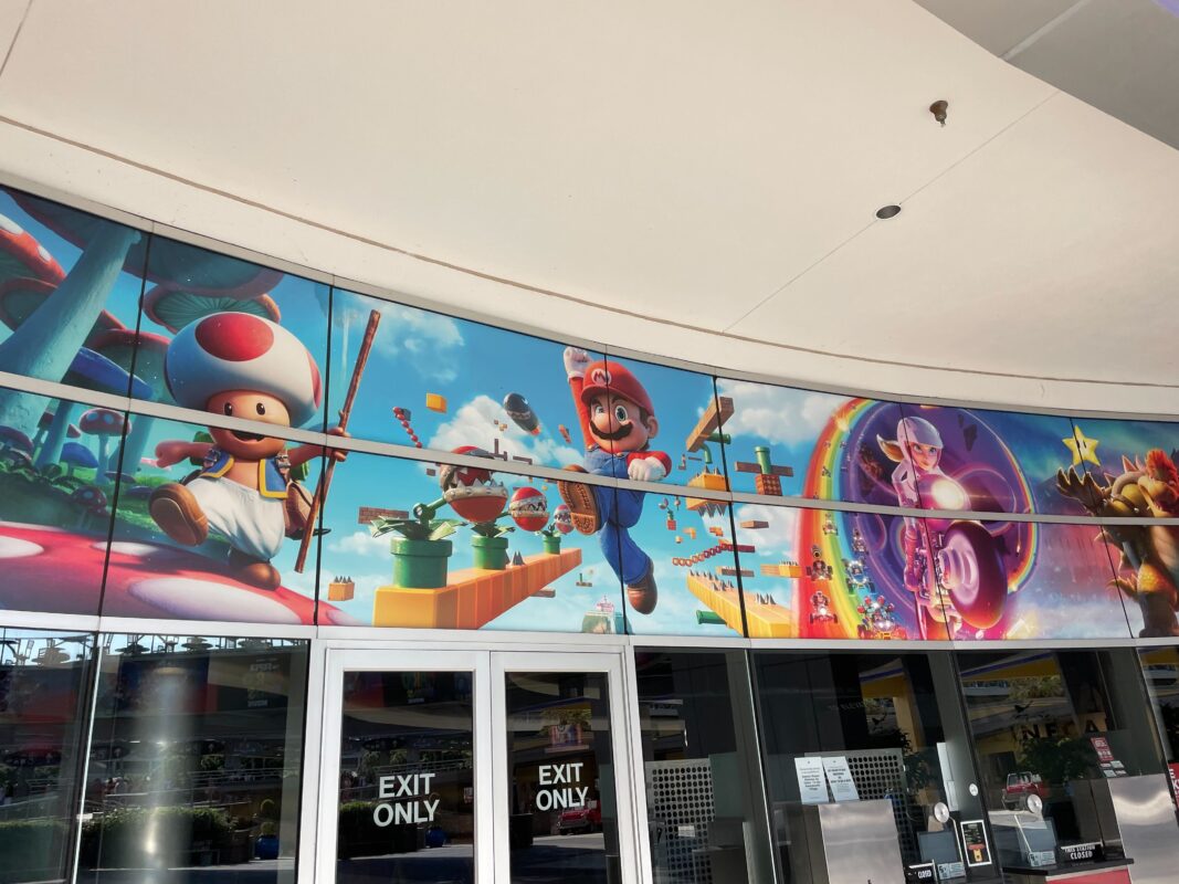 Banners for “The Super Mario Bros. Movie” line the Cinemark courtyard in Universal CityWalk.