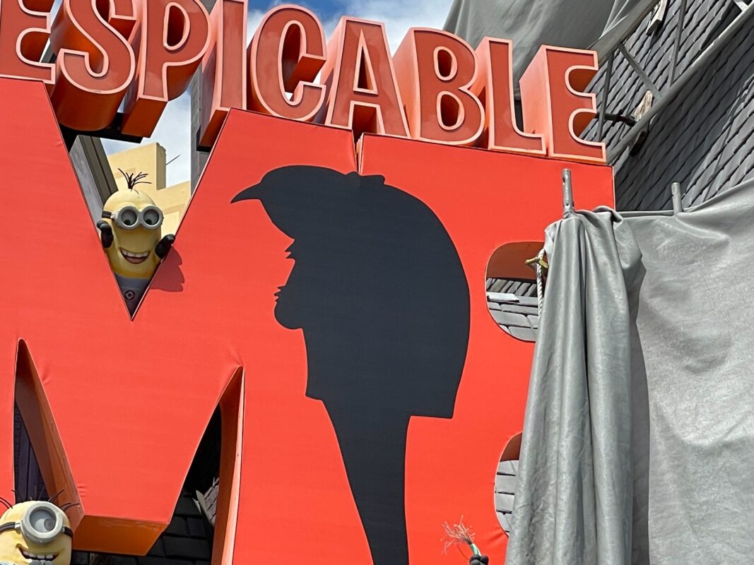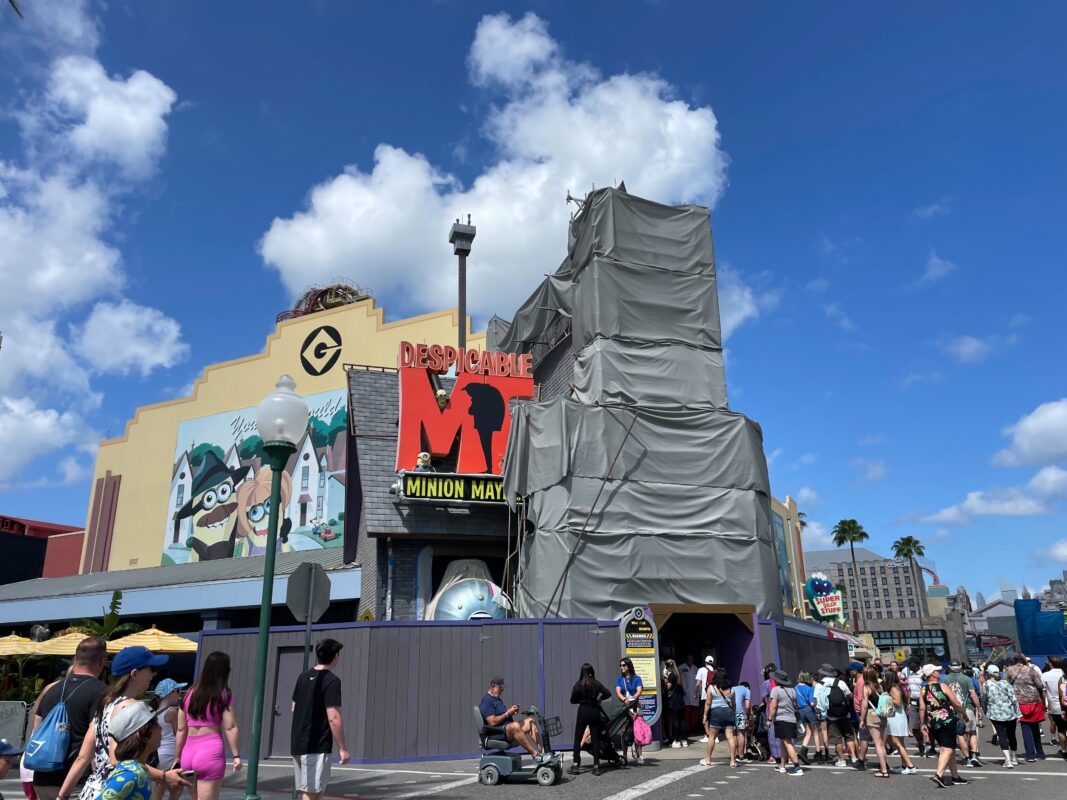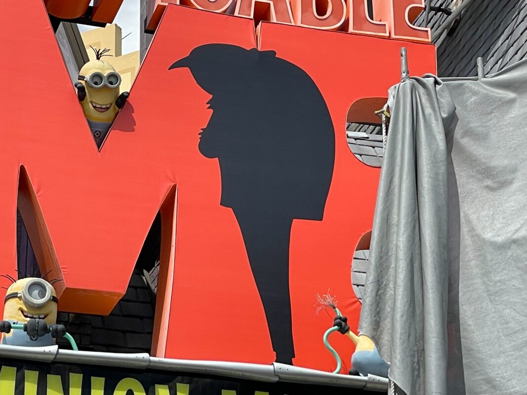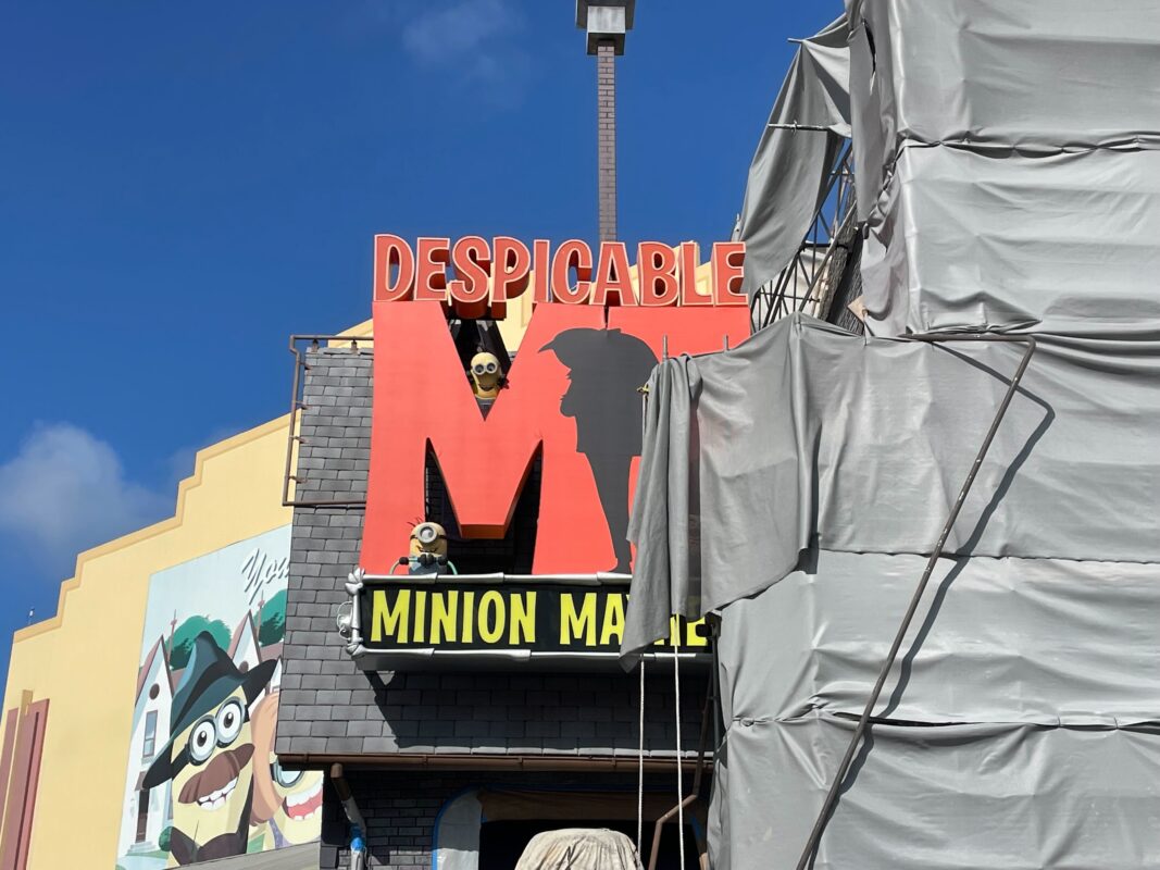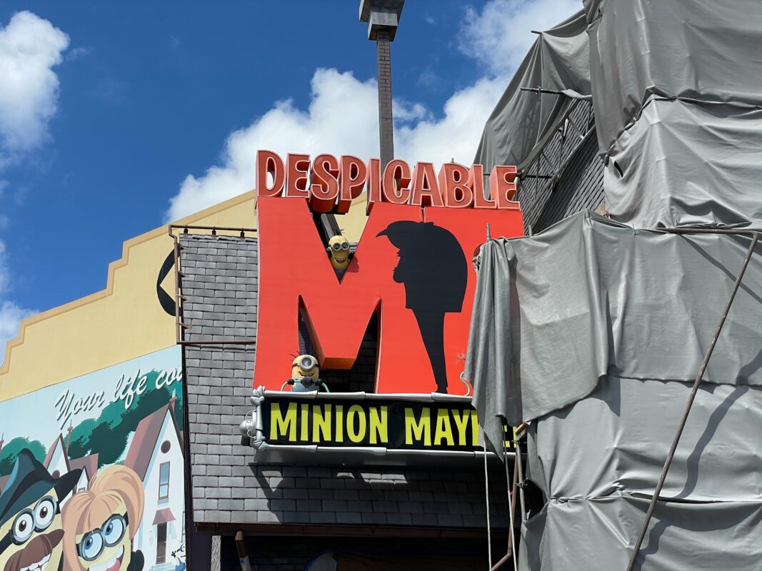 The “Me” part of the Despicable Me Minion Mayhem sign has been covered in what appears to be a vinyl wrap. Construction walls, scrim, and scaffolding have covered much of the attraction’s façade for refurbishment in recent weeks, but the sign has remained in view.