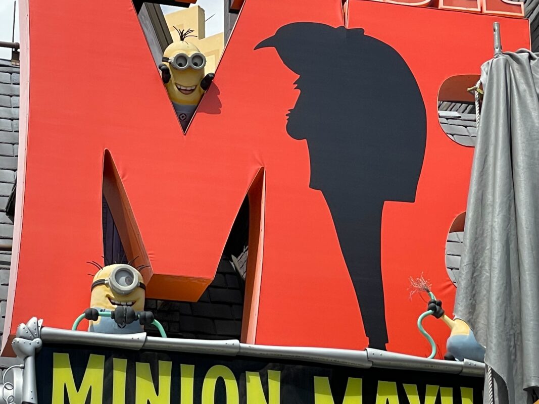 Three-dimensional Minion figures sit on and around the attraction sign.
