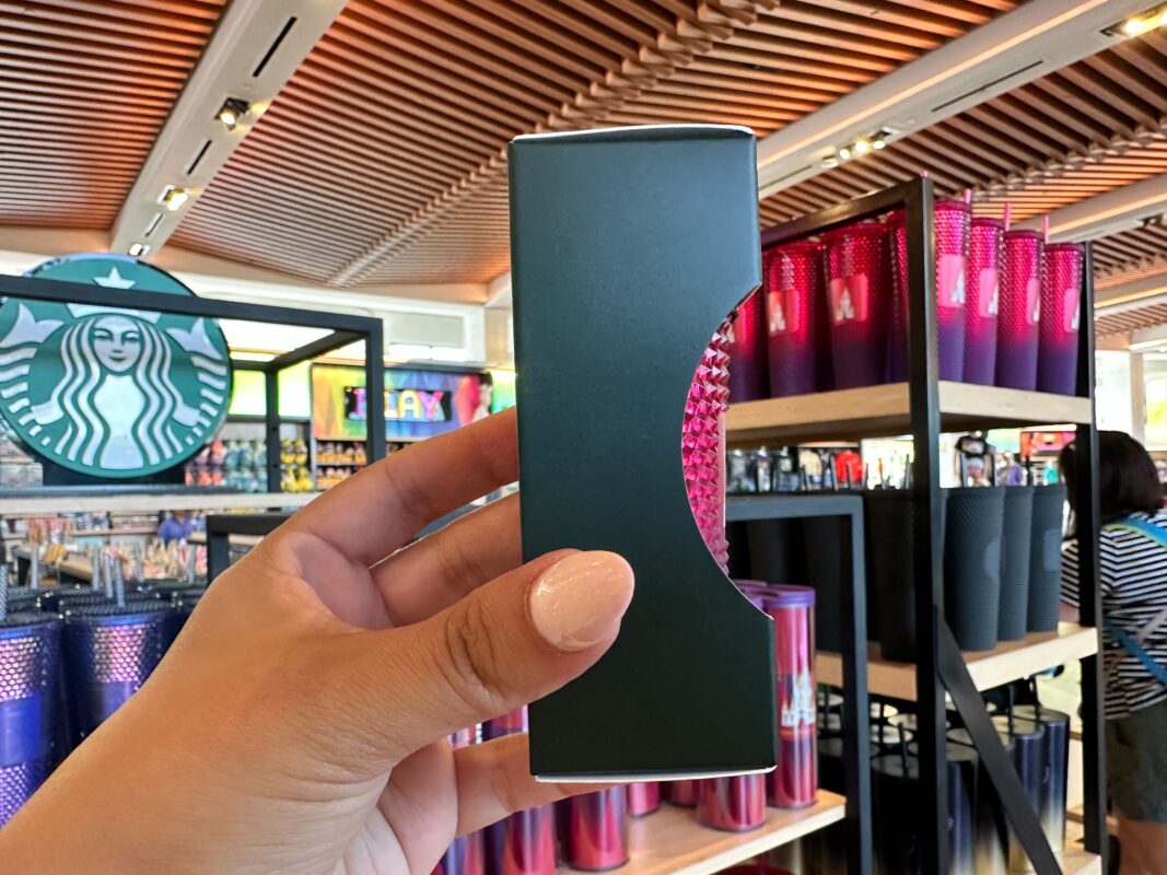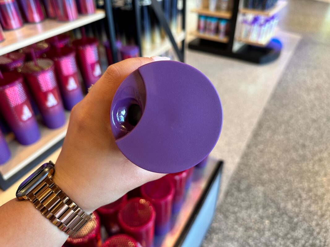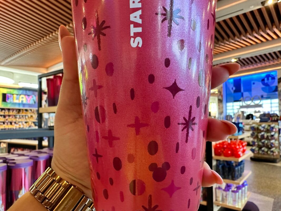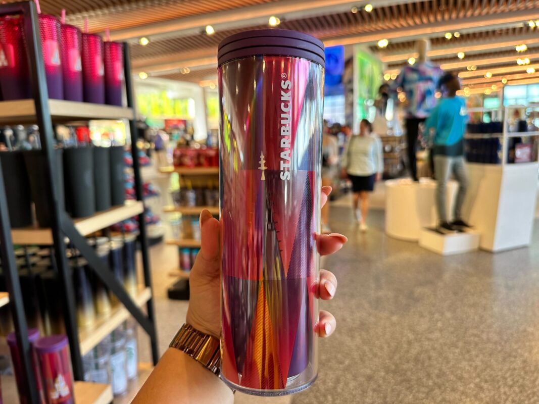 This tumbler comes with a straw and has a bejeweled appearance. A gradient from deep pink to purple travels down the side of the cup. The plastic jewels along the exterior of the cup, which Starbucks has used on drinkware in the past, remind us a little bit of Spaceship Earth.