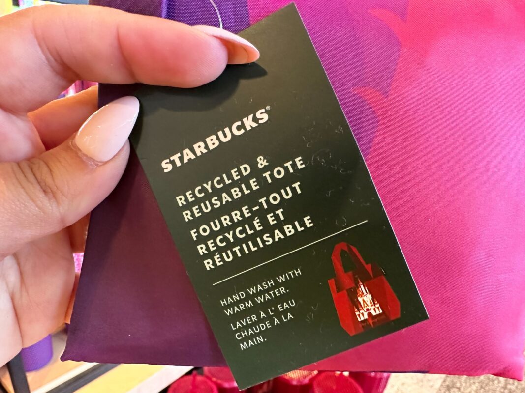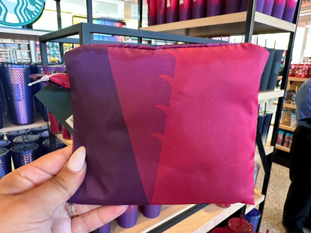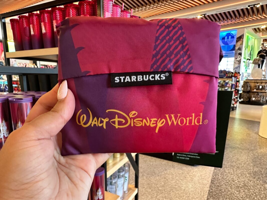 The tote has the same jewel tones as the rest of the merchandise, along with a Starbucks branded tag and the Walt Disney World logotype in gold across the front.