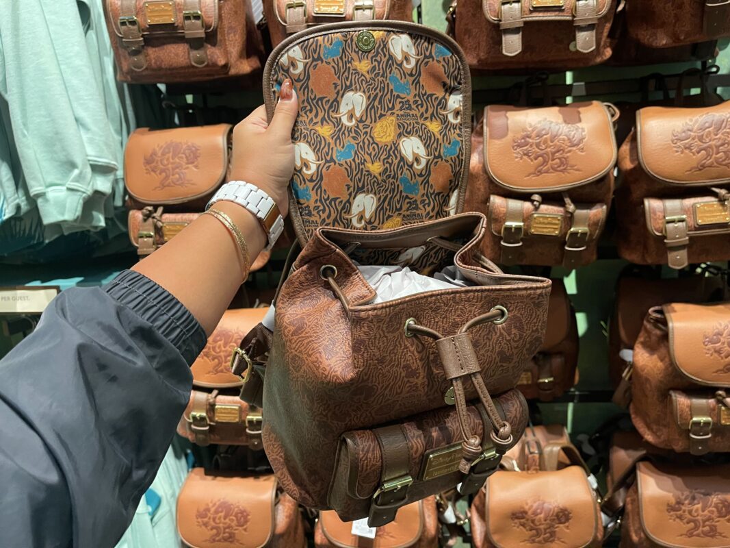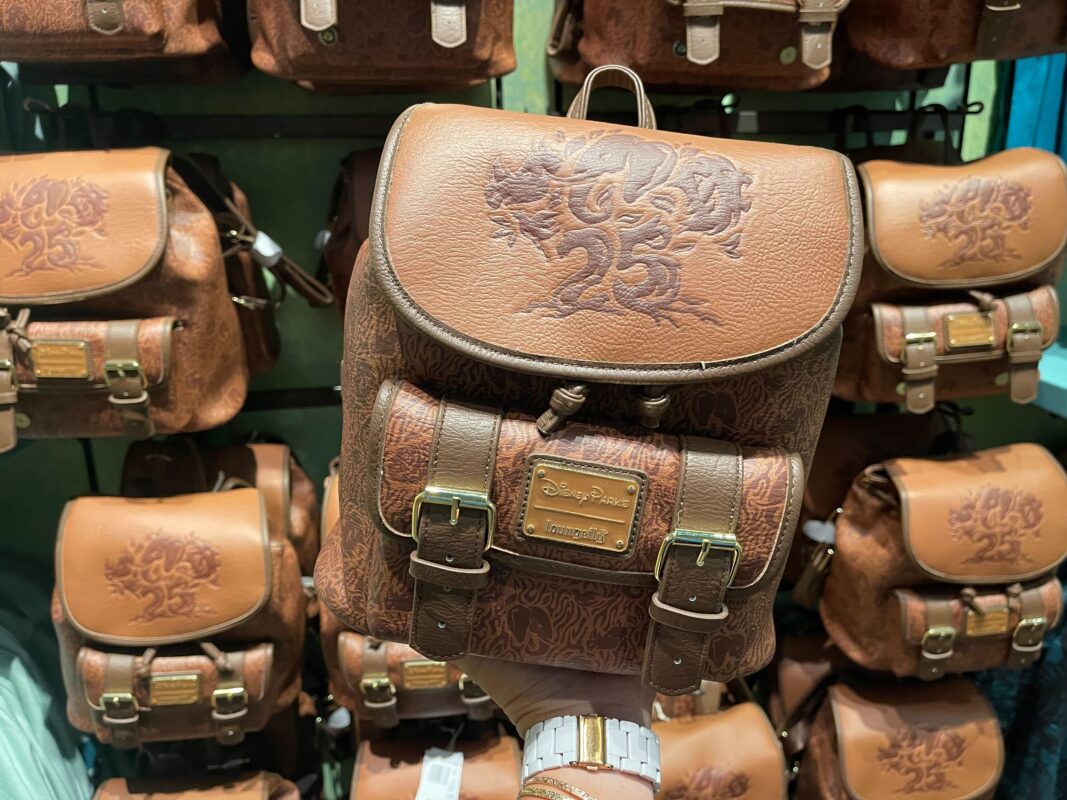 The Loungefly backpack is made of brown pleather, with a drawstring opening behind a flap and faux buckles on the front pocket. The Tree of Life, made up of animals and a 25, is stamped on the flap.