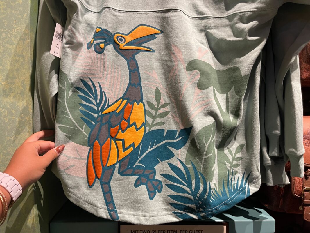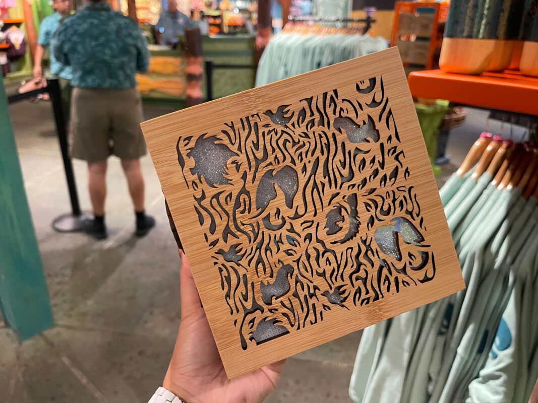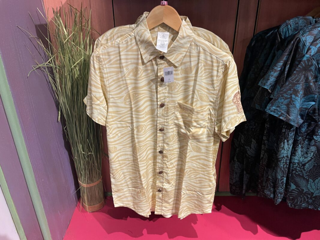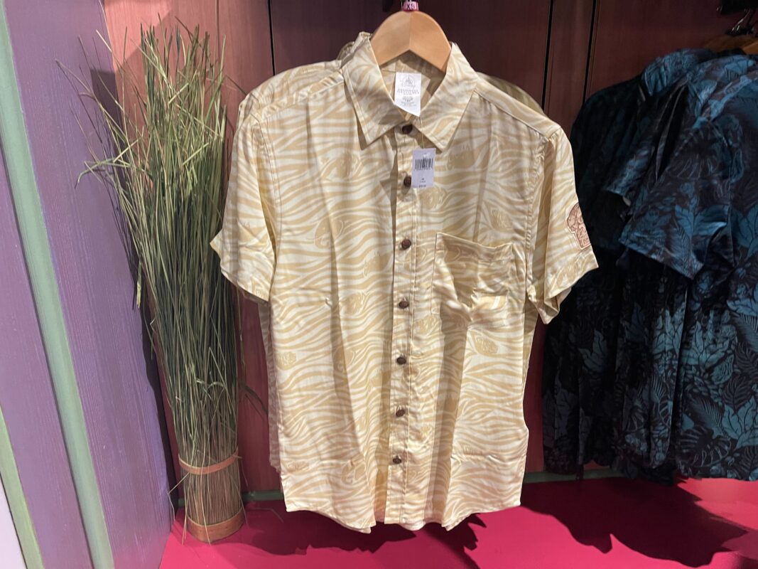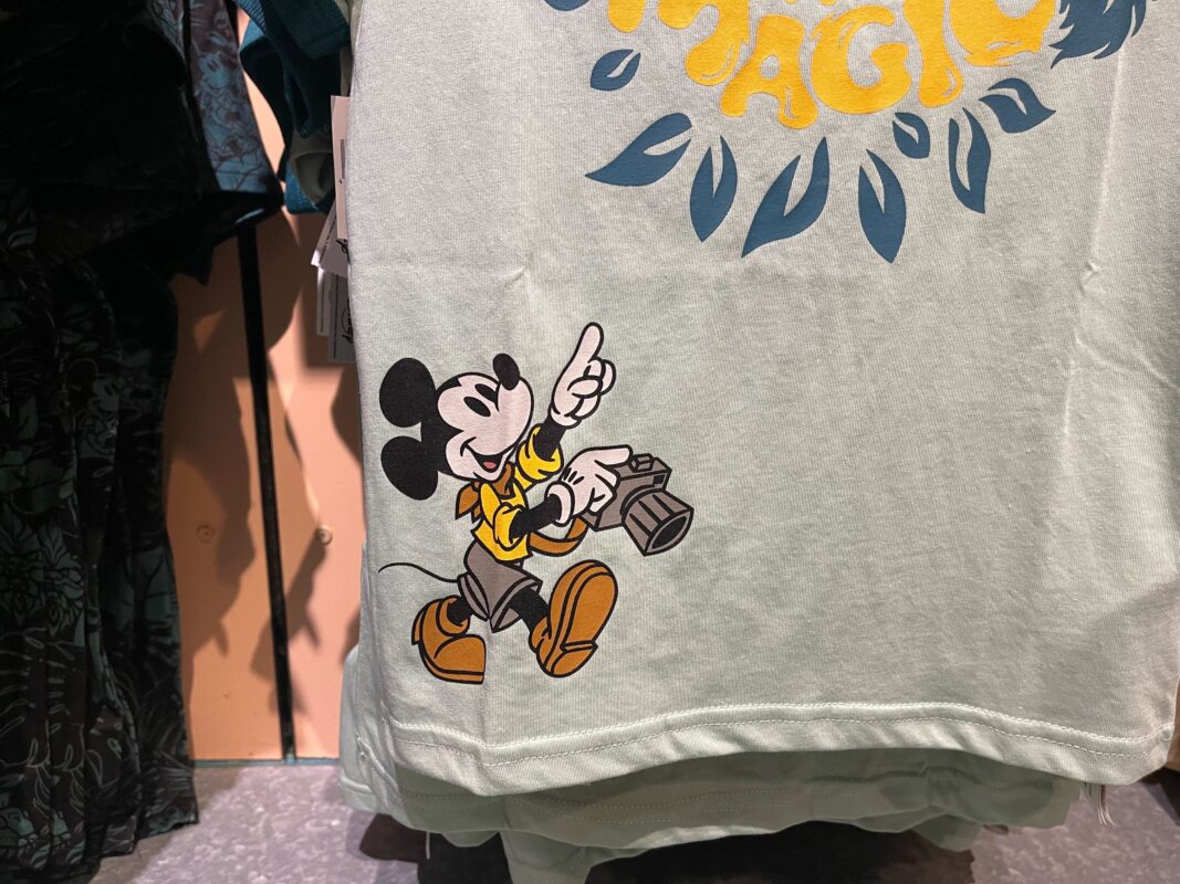 Exclusive to Annual Passholders is this black pocket tee with an all-over pattern of blue-green leaves. Hidden among the leaves are images of Mickey in his safari outfit, and animals, including some from Disney films.