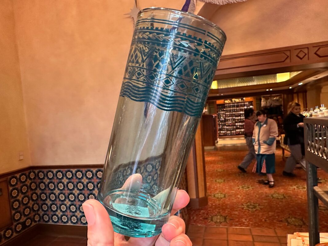 This glass tumbler features a wave, triangle, and diamond pattern in blue around the top.