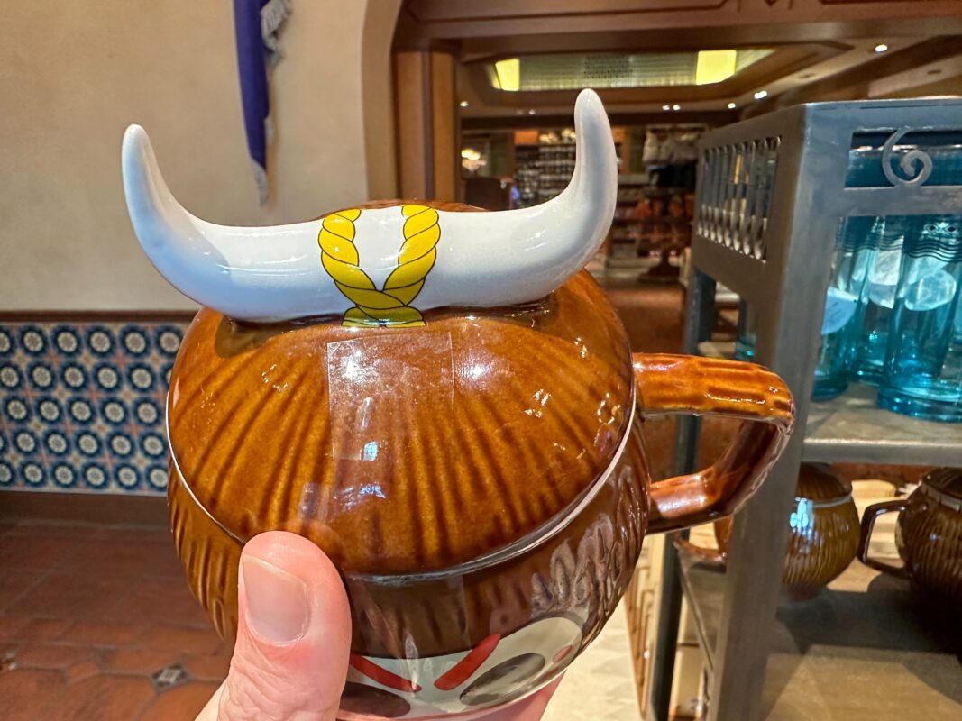 The stoneware mug resembles a coconut with an angry face painted on one side. The horns act as a handle for the mug’s lid.