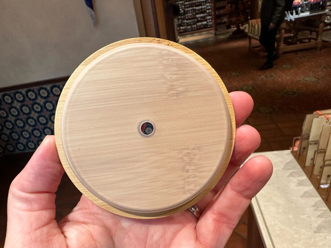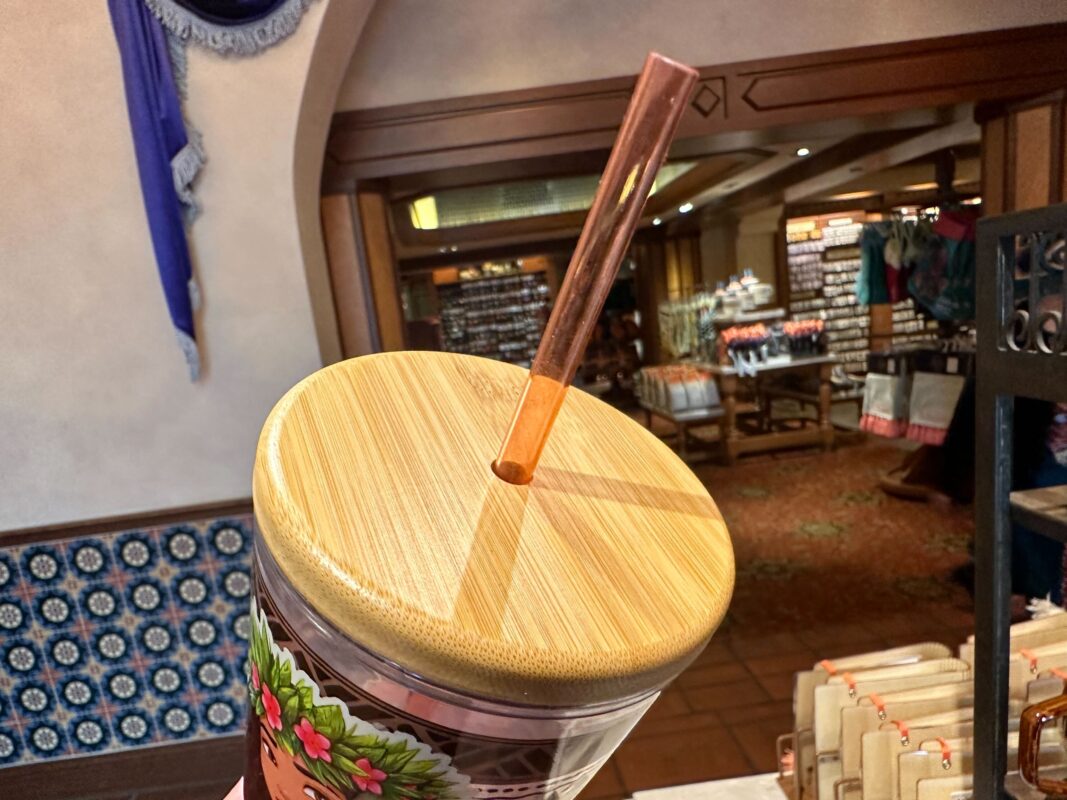 The lid has a wood finish and it includes an orange translucent reusable straw.