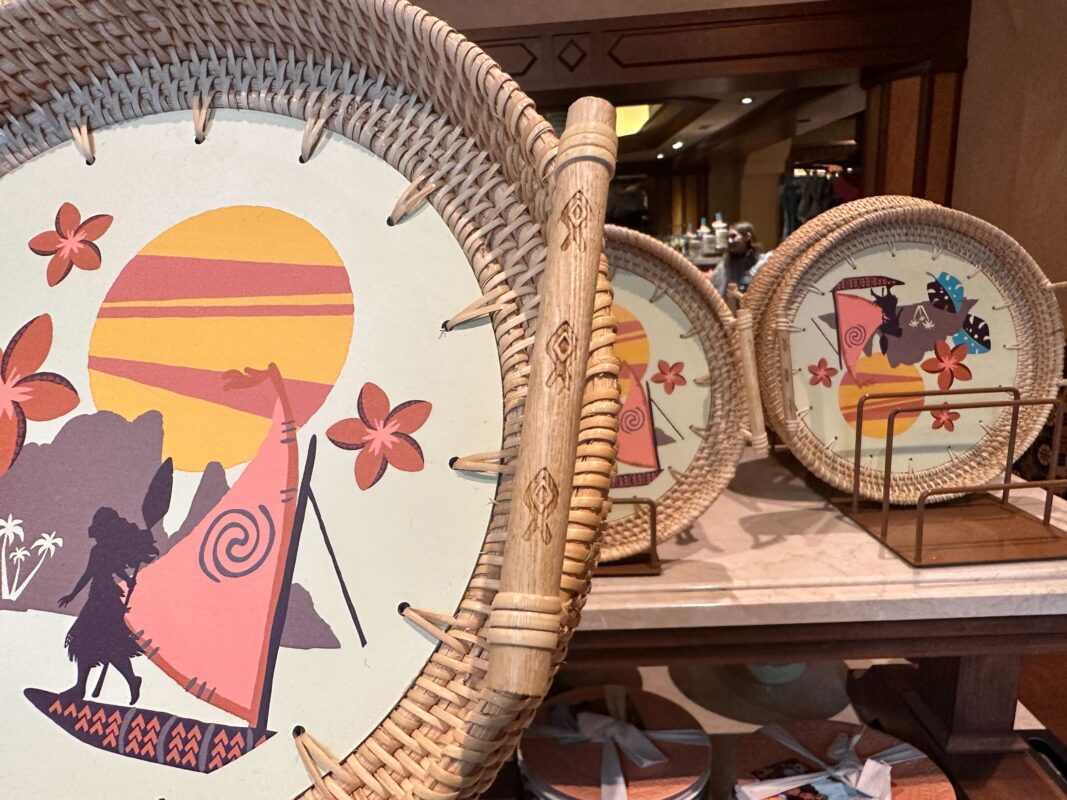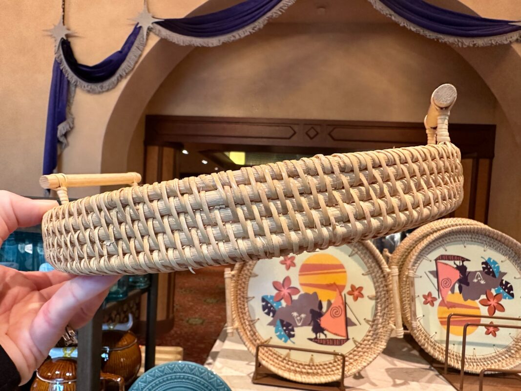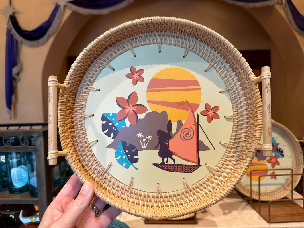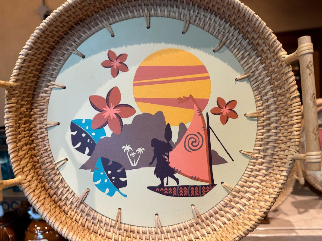 The center of this wicker tray shows Moana’s silhouette on her boat, with an island rising behind her, large tropical flowers, and the sun.