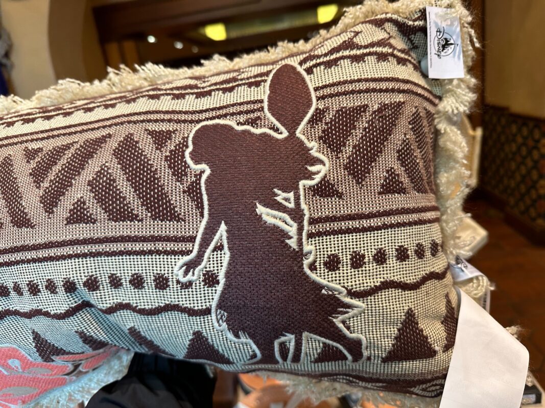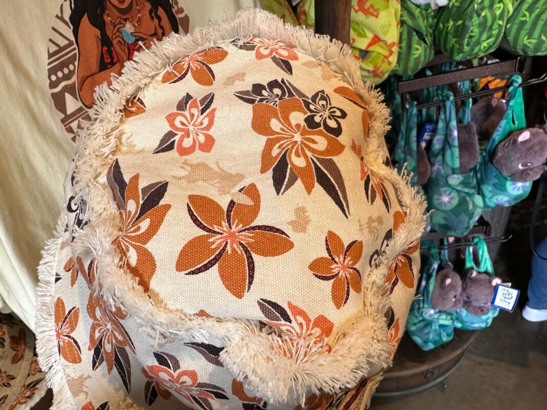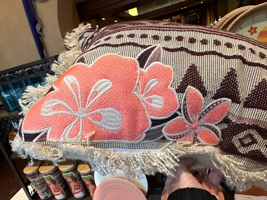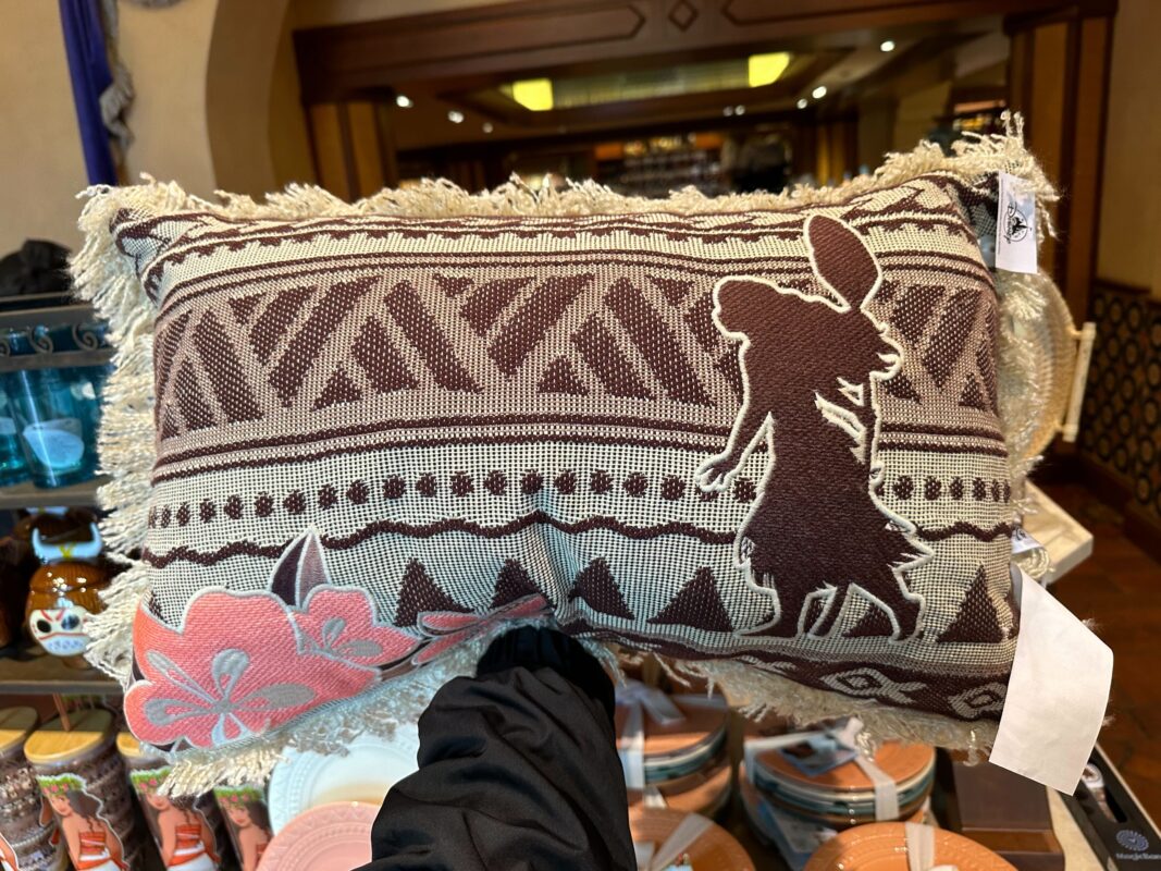 This throw pillow has Moana’s silhouette running across it. Coral-pink flowers are in the corner. The stripe pattern features triangles and fish symbols.