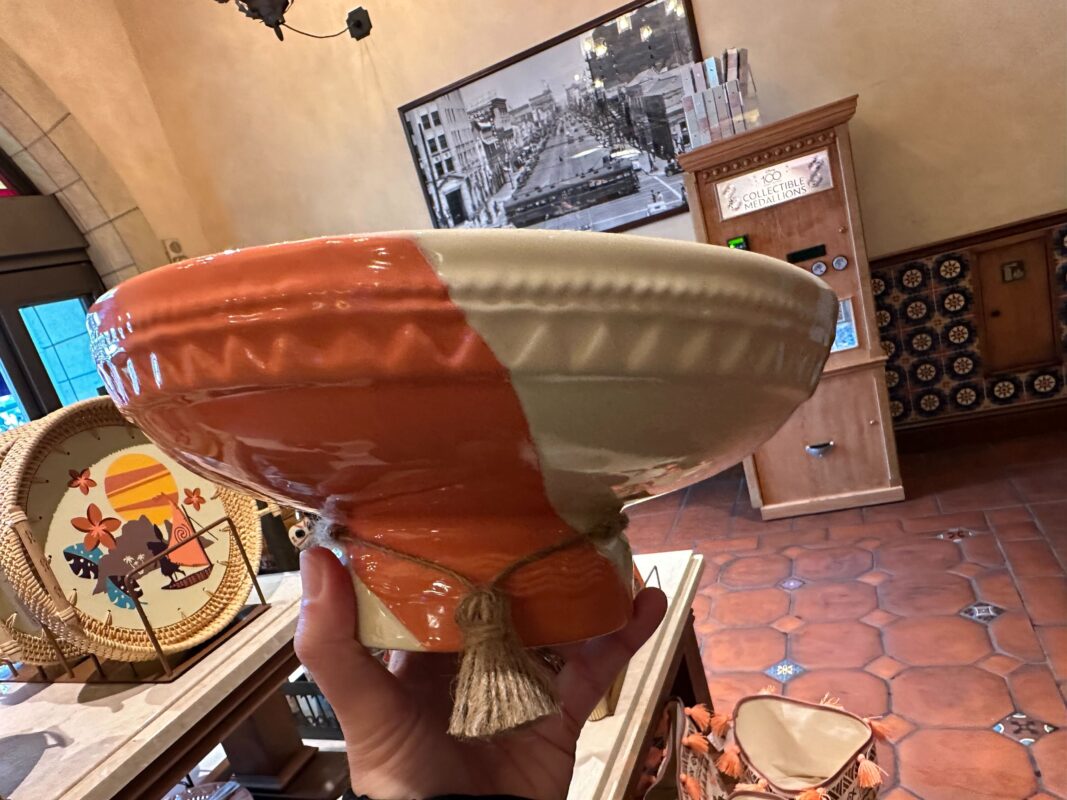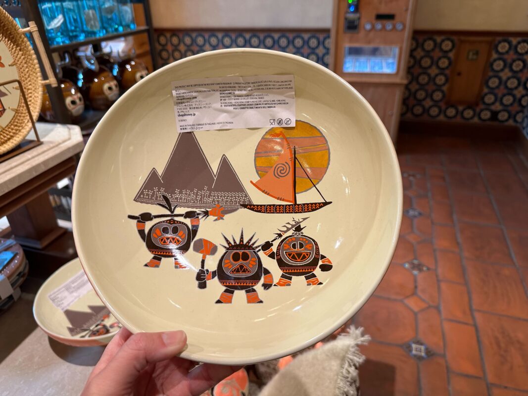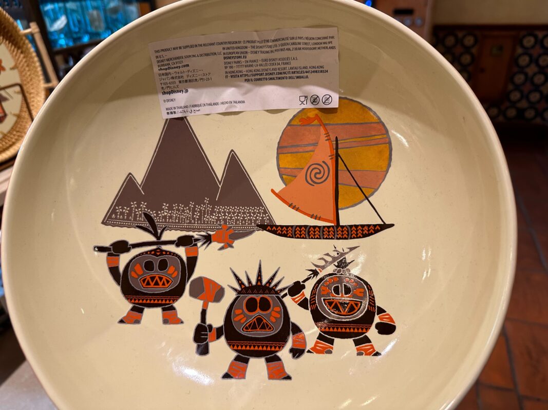This large serving bowl features three Kakamora, with mountains and Moana’s boat behind them.