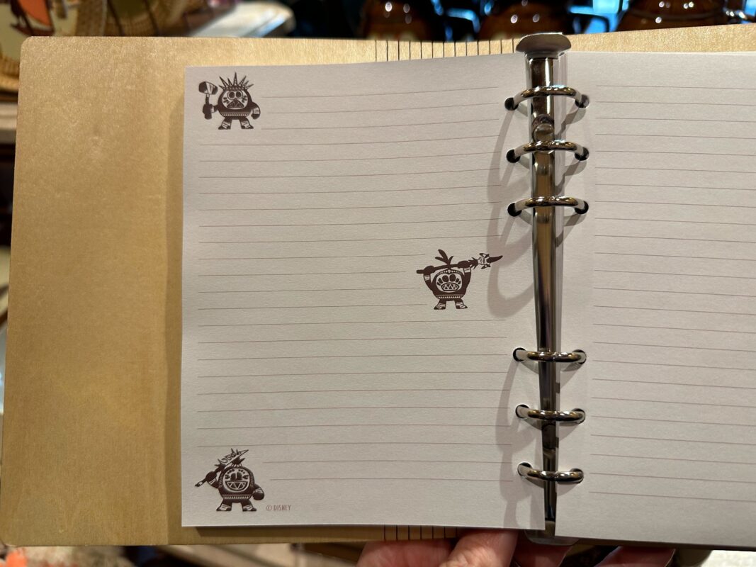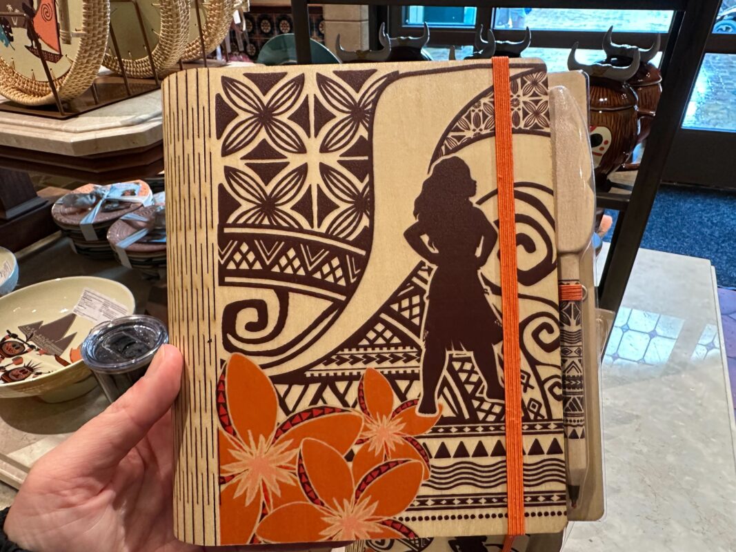 Moana’s silhouette is set against a dark pattern on the front of this wood cover journal. Orange flowers are in the corner and it has an orange elastic strap. It’s supposed to look wood burned.