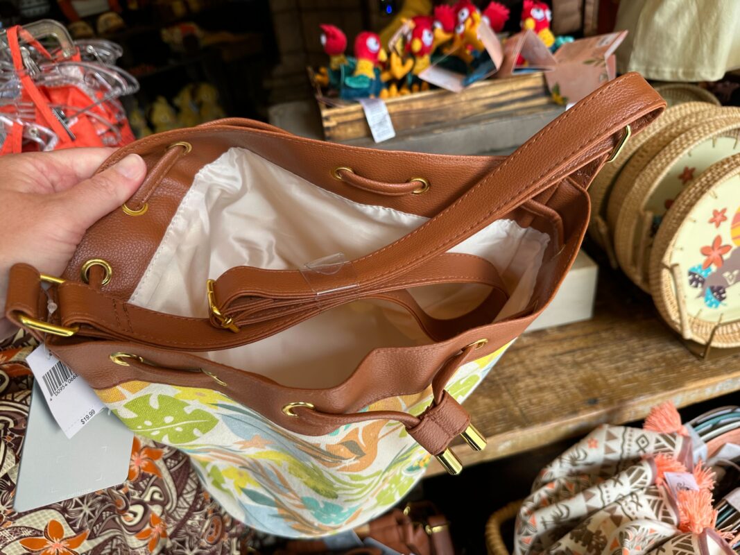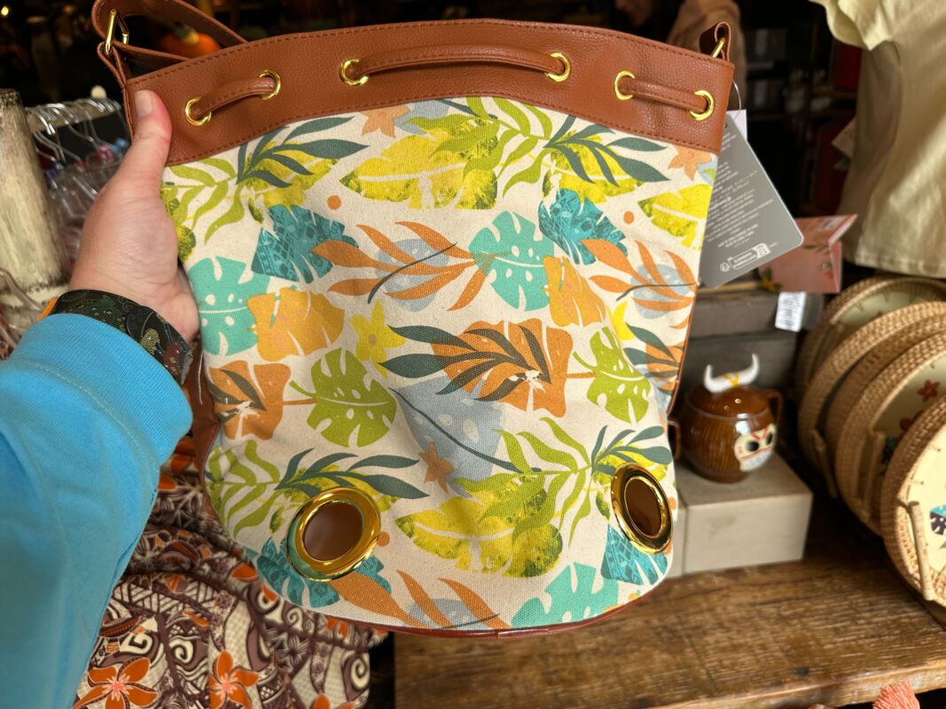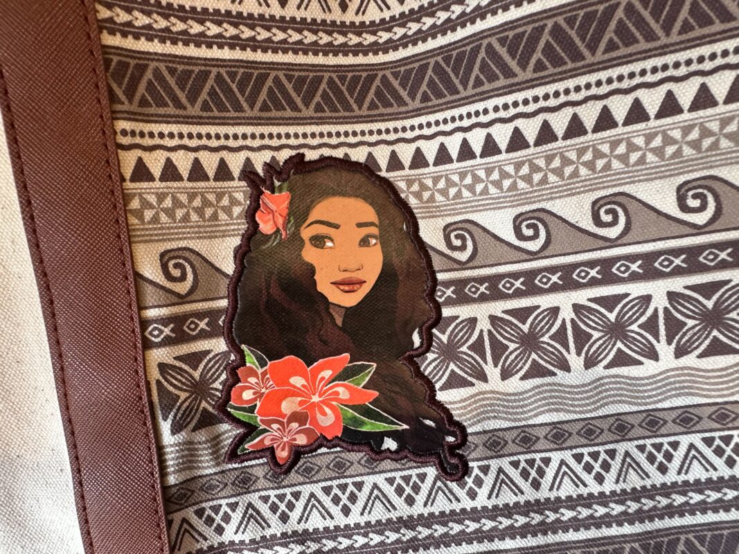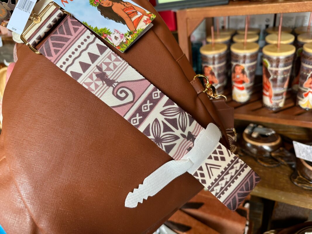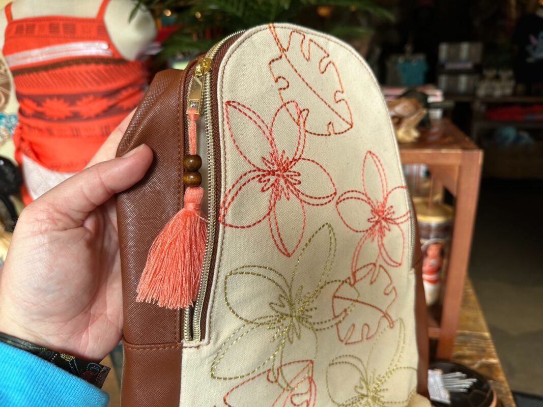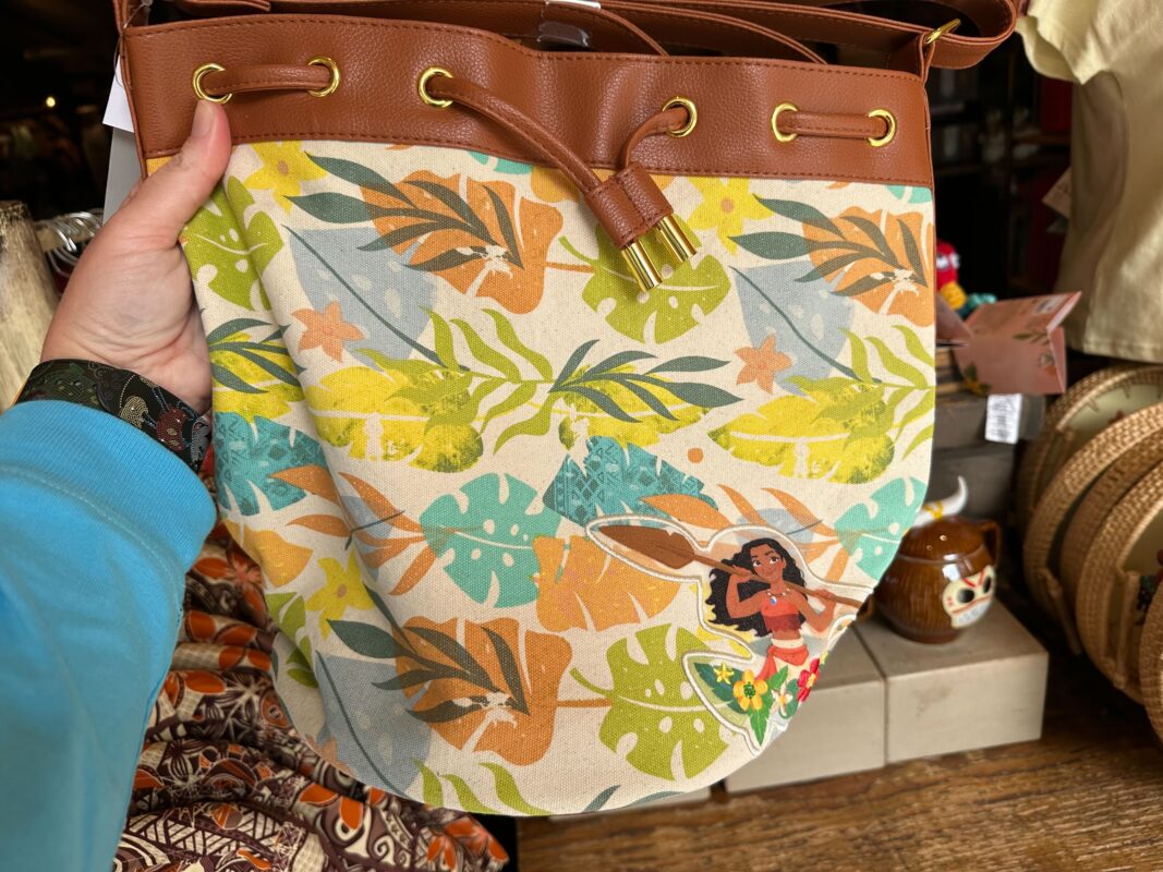 This purse is covered in colorful leaves, with a patch of Moana holding her oar in one corner.