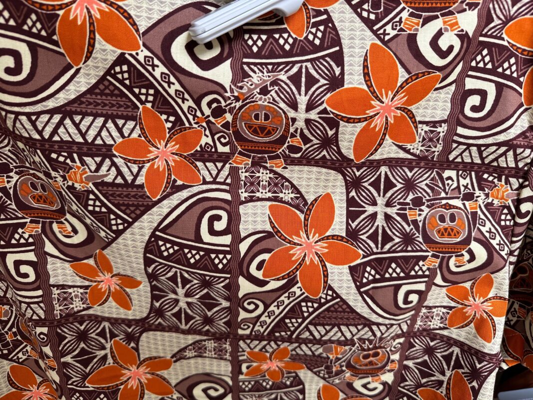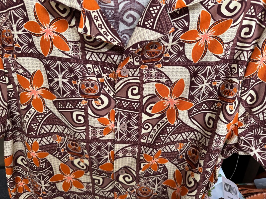 This button-up is covered with tropical flowers and images of Kakamora against a Polynesian pattern.