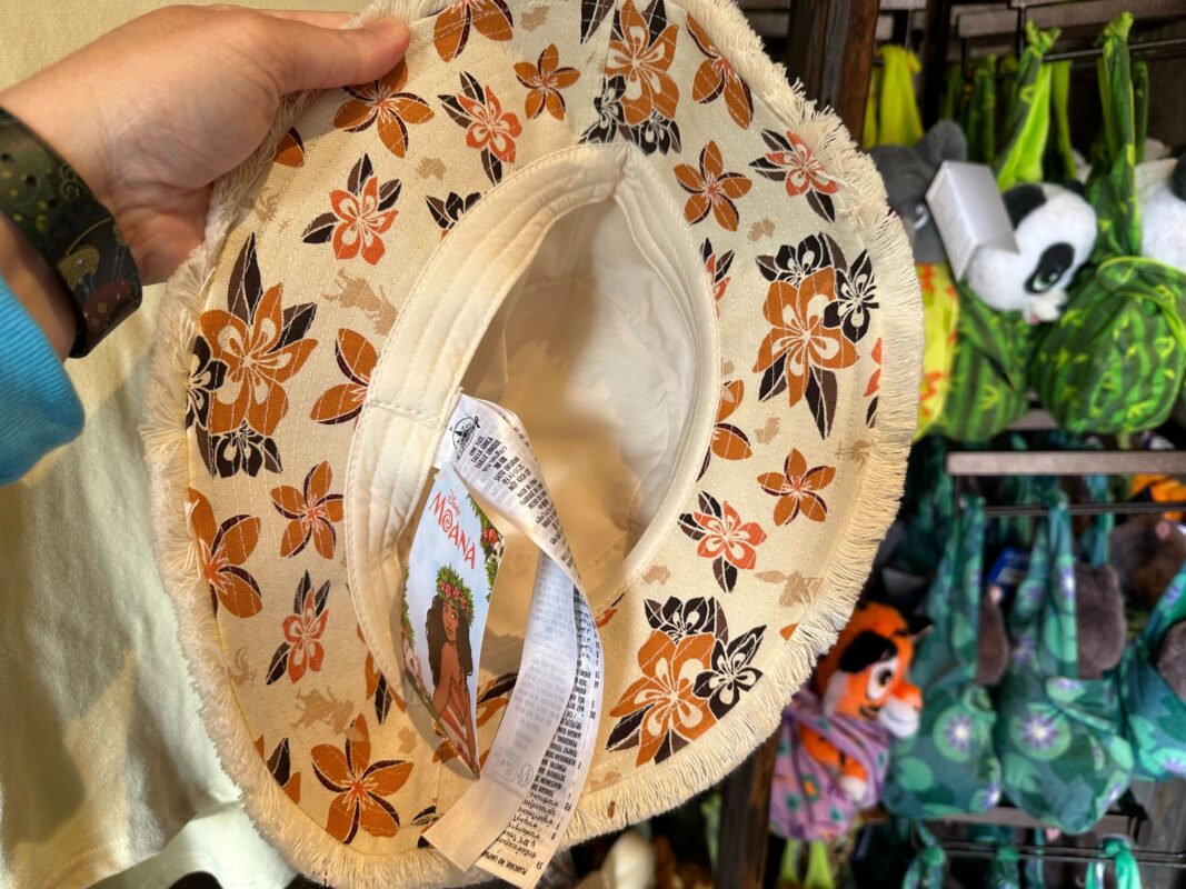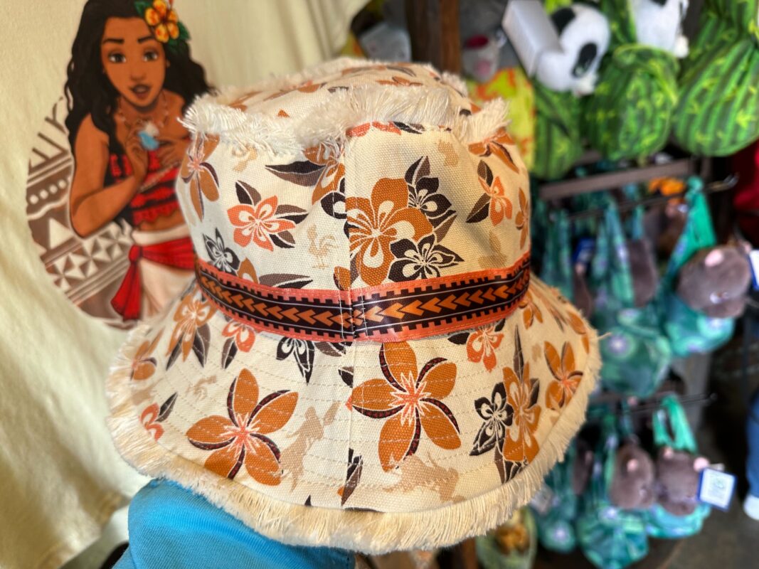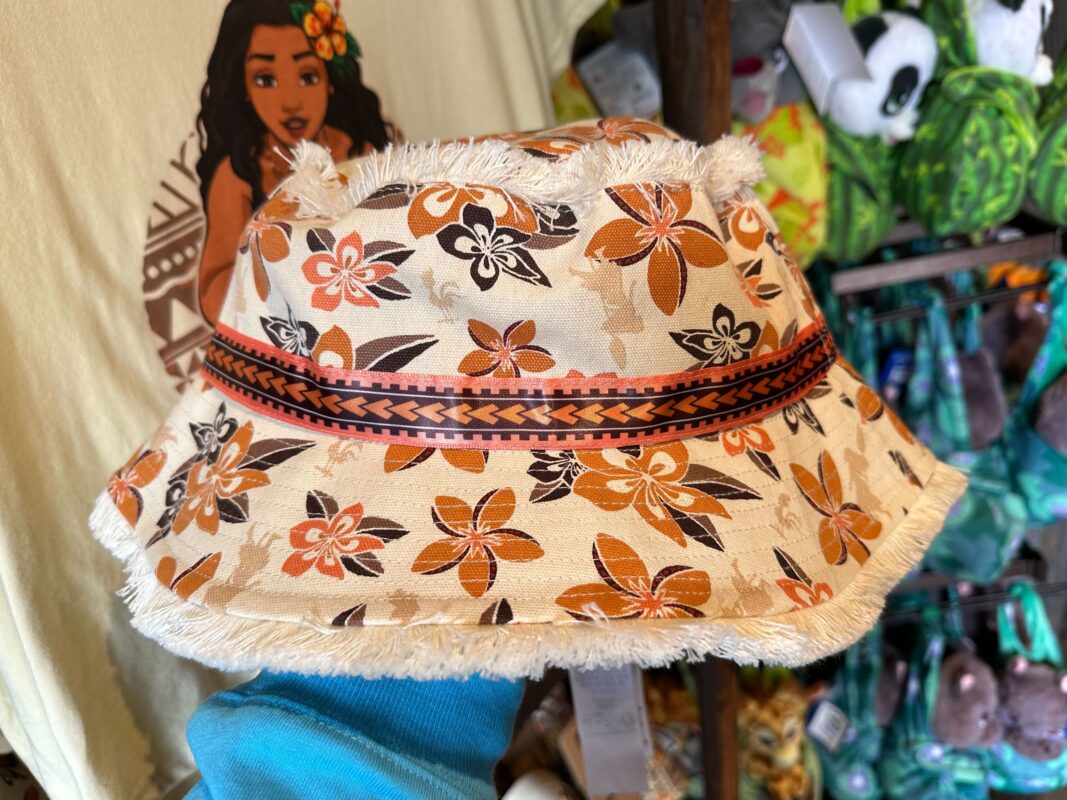 The bucket hat uses a white fabric covered in red and orange flowers and the silhouettes of “Moana” characters.
