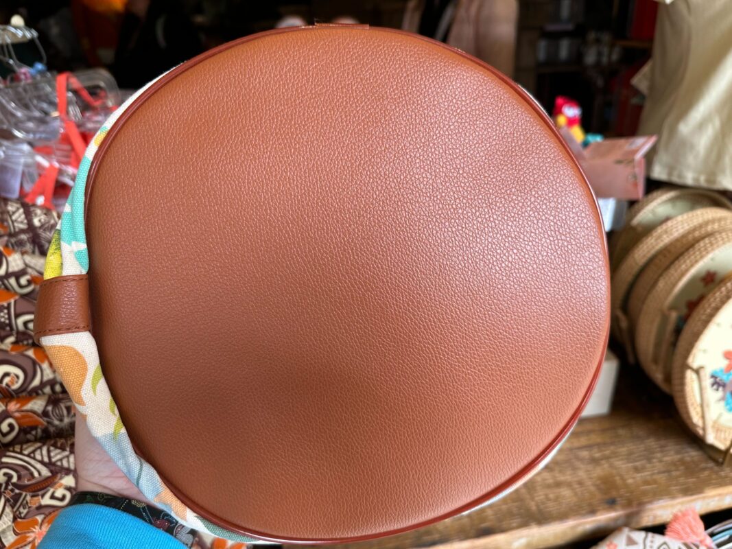 The strap and top are brown pleather with a drawstring.