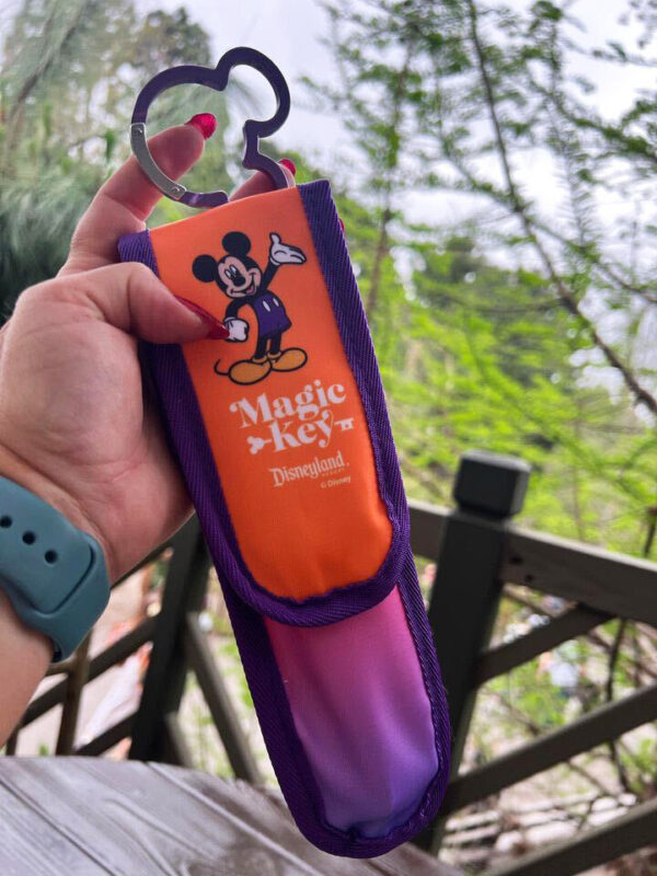 The pouch is made of canvas, and the two sets feature different designs. The Magic Key utensil set has a gradient similar to a sunset with Mickey smiling on the front flap. Both sets come with a Mickey Mouse head-shaped carabiner, so your utensils can be always at the ready.