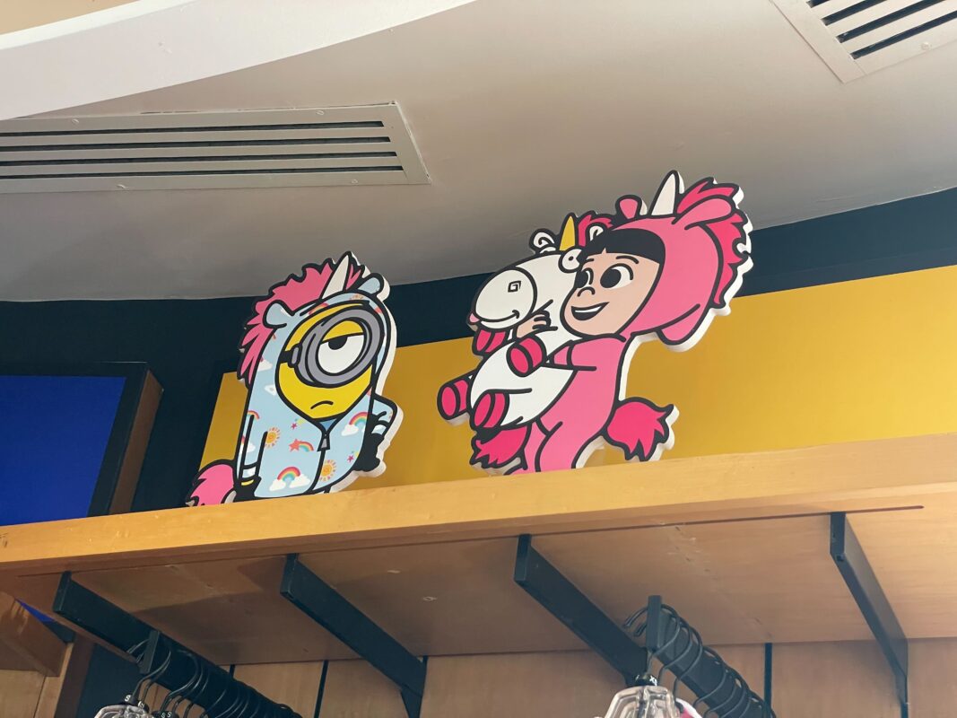 A one-eyed Minion in a unicorn onesie is seen next to Agnes and a fluffy unicorn plush.