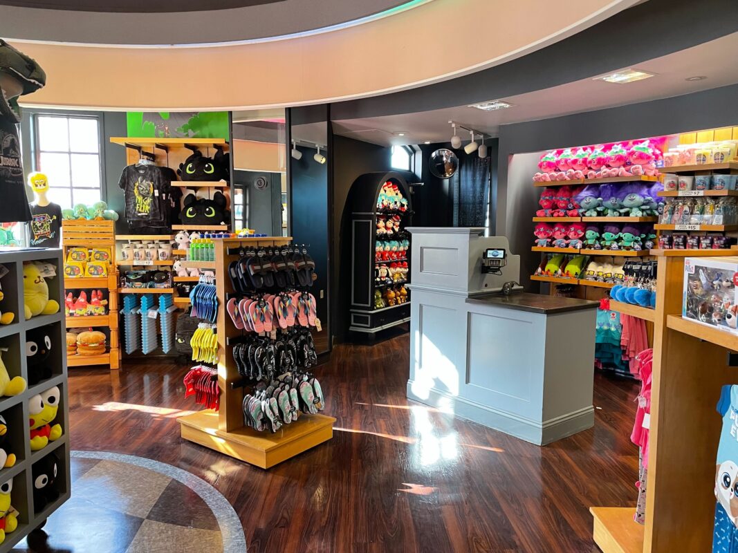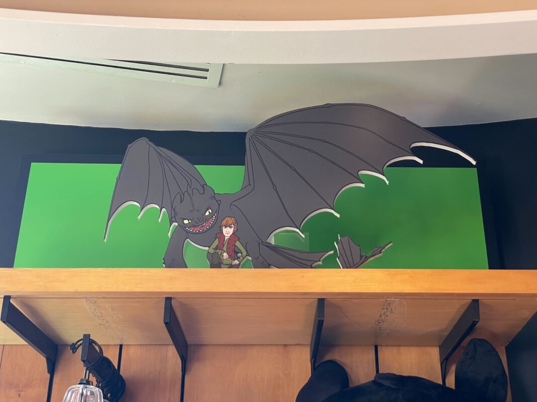 Hiccup and Toothless are above a small section of “How to Train Your Dragon” merchandise.