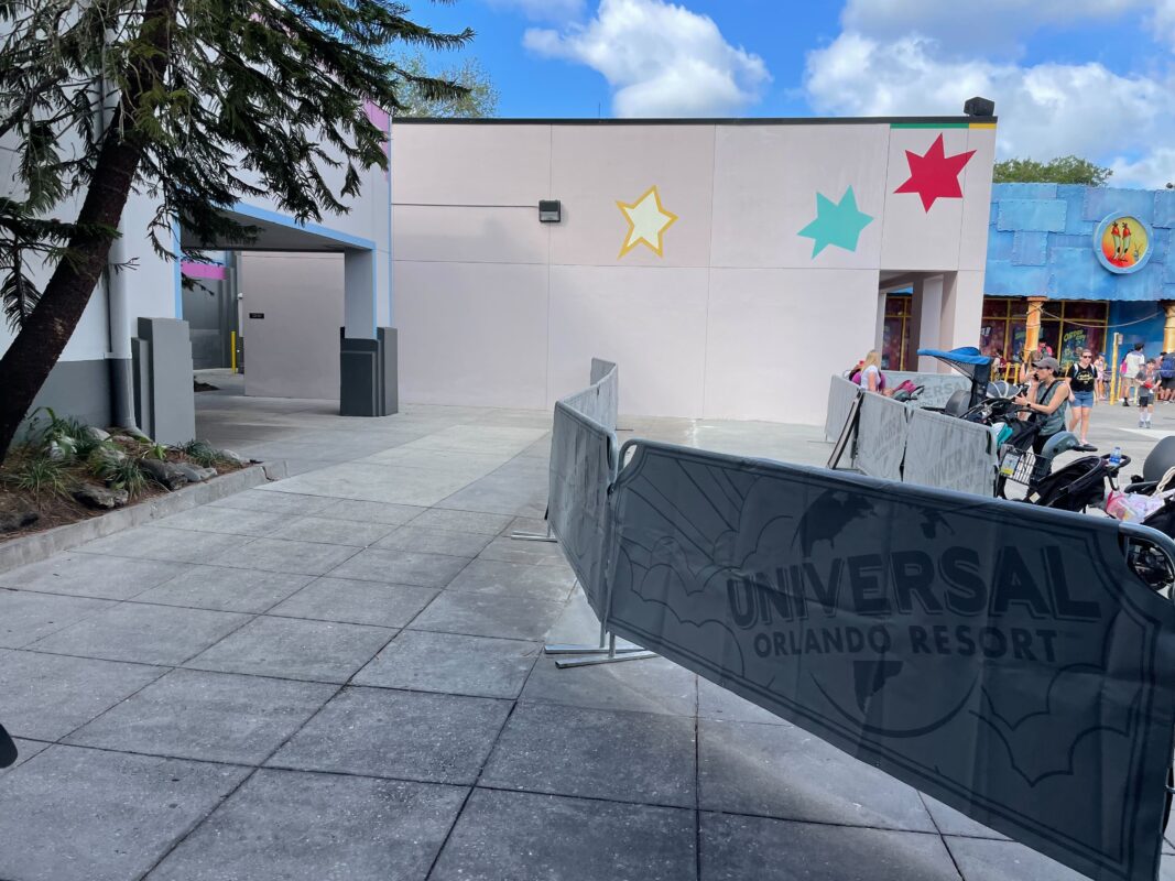 Woody Woodpecker’s KidZone at Universal Studios Florida closed earlier this year to make room for something new. The E.T. Adventure was not effected by the closure, but we can see some of the changes starting to creep closer. Planters and seating were removed from the area, followed by construction walls going up between the restrooms and E.T.’s Toy Closet. The walls have come down now, revealing fresh new pavement.