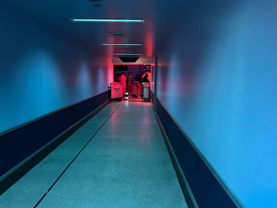 Temporary signs point single riders through the exit hallways, so they know they’re still going the right way.
