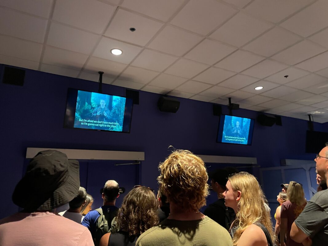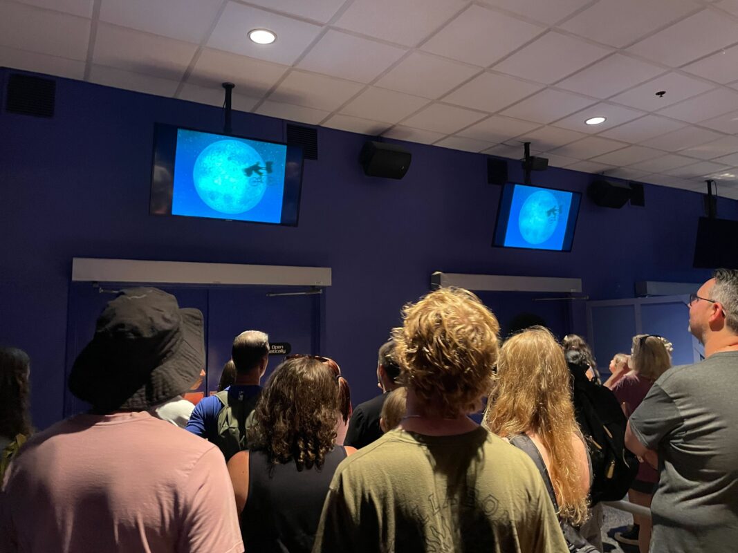 The pre-show, featuring the director of “E.T.” Steven Spielberg, plays on two screens at the front of the room.