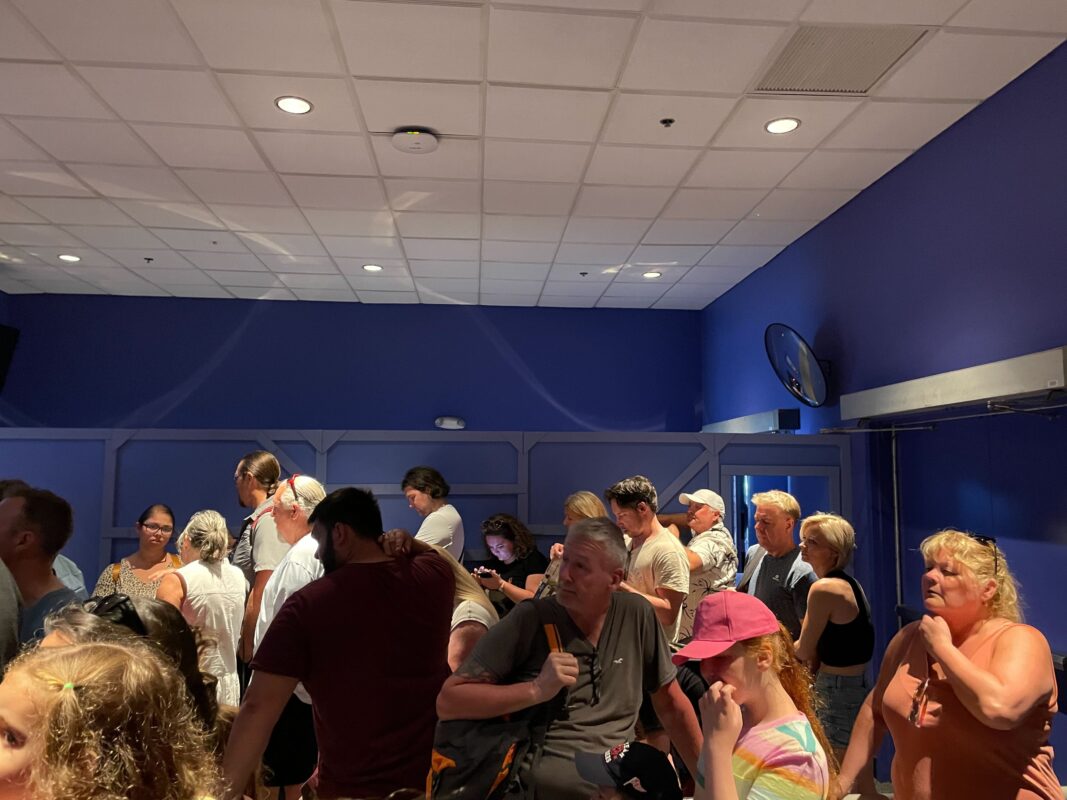 The “E.T.” movie posters in the queue were recently replaced after 30th-anniversary posters hung there for over ten years.