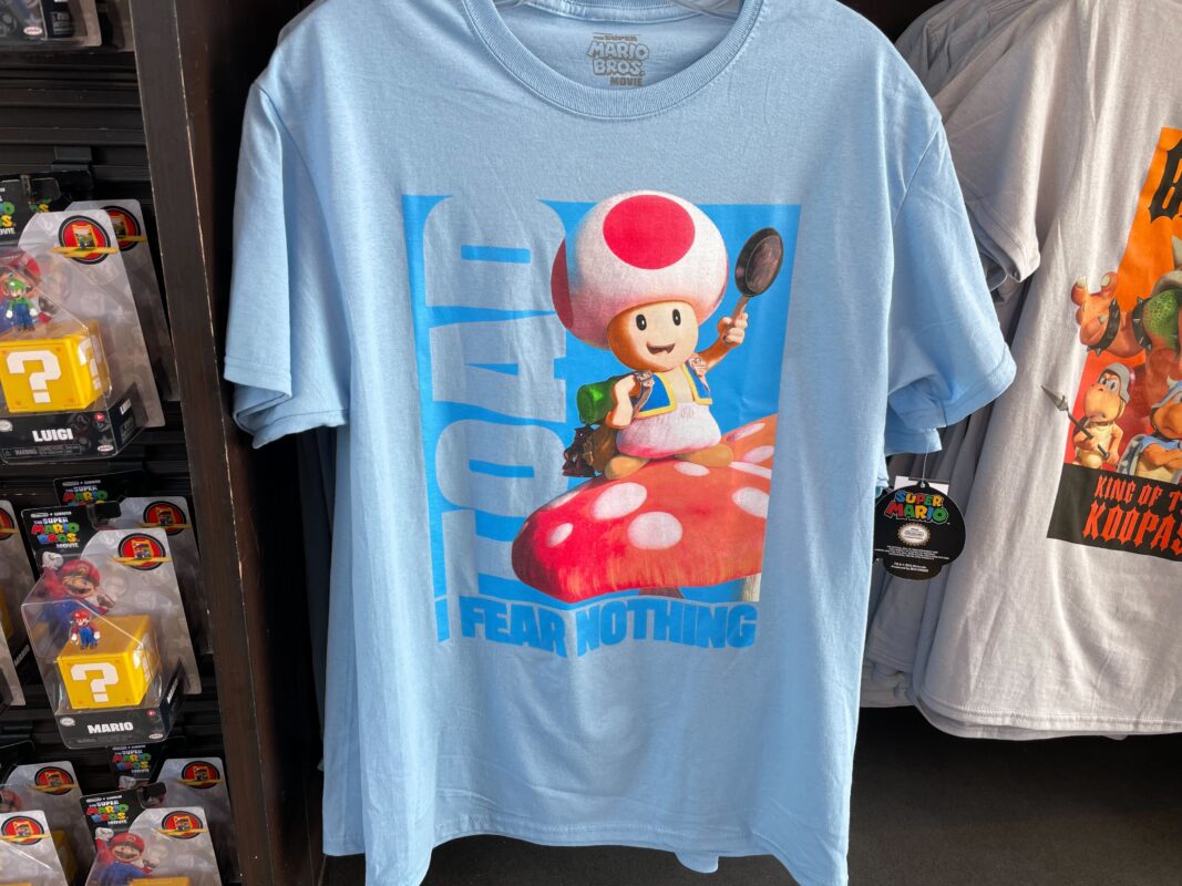 The Toad t-shirt features Toad as portrayed by Keegan-Michael Key standing atop a mushroom with his trusty frying pan. The blue background has “Toad” cut out on the left side. Below are the words “I fear nothing” as said by the mushroom-headed toad himself.