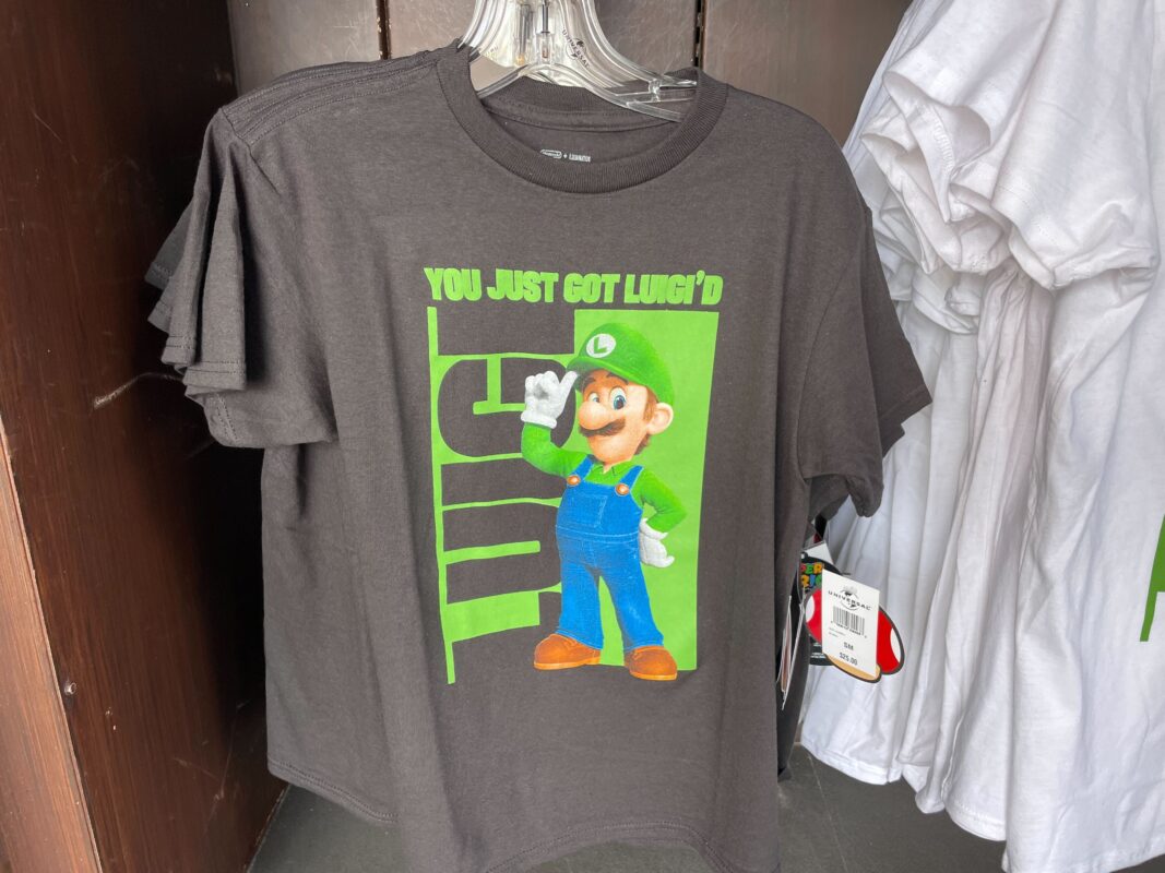 The white shirt features a plain green rectangle with “Luigi” cut out of it on the left. In front is of course the movie version of Luigi, portrayed by Charlie Day. Atop the shirt reads “You just got Luigi’d,” which he shouts in victory after briefly defeating a Dry Bones in the Dark Lands.