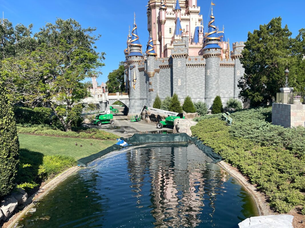 Cast Members needed to drain part of the moat in order to access the sides of Cinderella Castle. Cherry pickers have been parked in the moat for several weeks as work removing 50th Anniversary Celebration decorations continues.