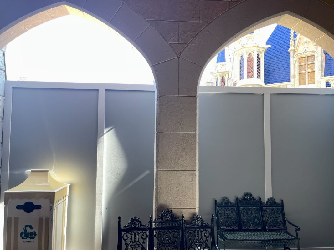 Just behind Cinderella Castle and adjacent to Sir Mickey’s, tall gray construction walls have been set up to help facilitate work on the area. The work site appears to be for removing the remaining 50th Anniversary Celebration decorations and doing necessary repairs.