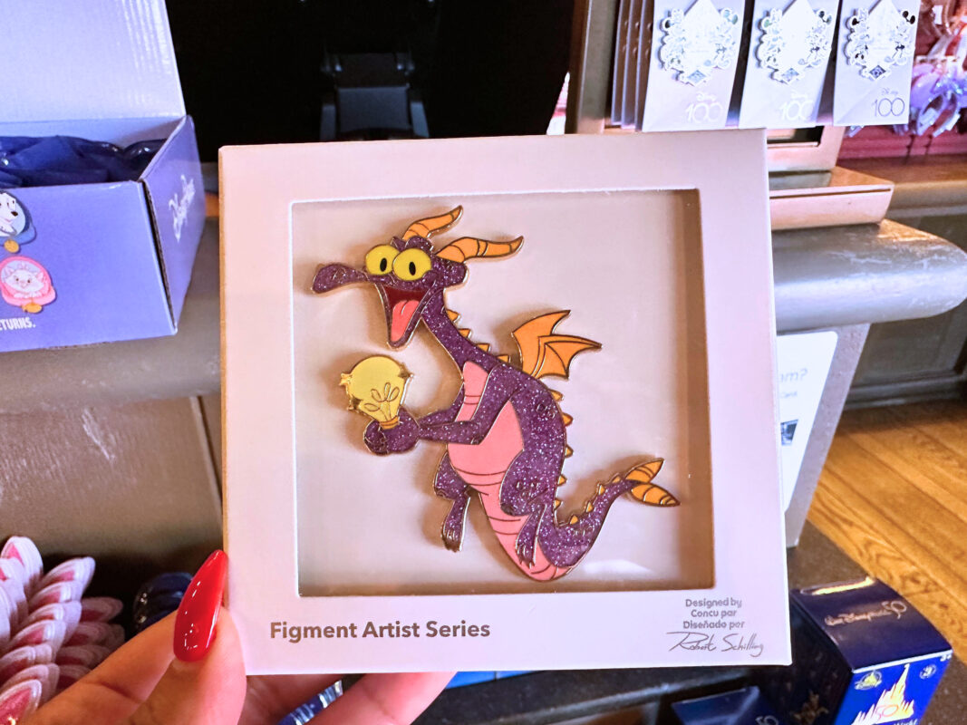 A Figment Artist Series pin is also available in this location. He is a glittery purple and holds a sparkling lightbulb. This item is also larger than a standard pin release.